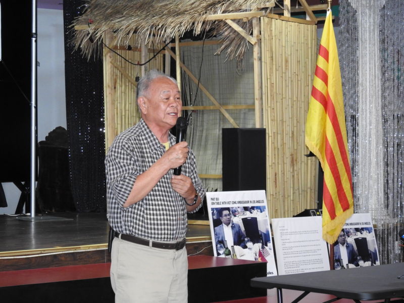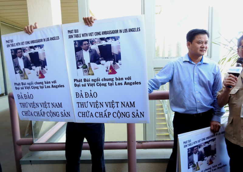 Ông Ngô Đình Lượng, một thương gia, đại diện nhóm người chống, cho biết: “Chúng tôi không biểu tình, nhưng chỉ muốn cho mọi người hiện diện thấy hình ảnh ông Phát Bùi ngồi chung bàn với đại sứ Việt Cộng ở Los Angeles. Ông ấy làm ăn với CSVN thì làm sao làm chủ tịch cộng đồng được!”