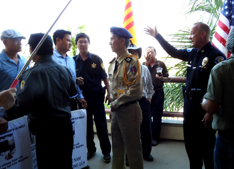 Phe bên trong, một số người ào ra, cũng lớn tiếng nói “không cho vào, đi ra chỗ khác.” Sau đó Đại Úy Thomas DaRé, cảnh sát Garden Grove, đến tham dự buổi lễ, đã yêu cầu nhóm ông Lượng phải ra vỉa hè để biểu tình.