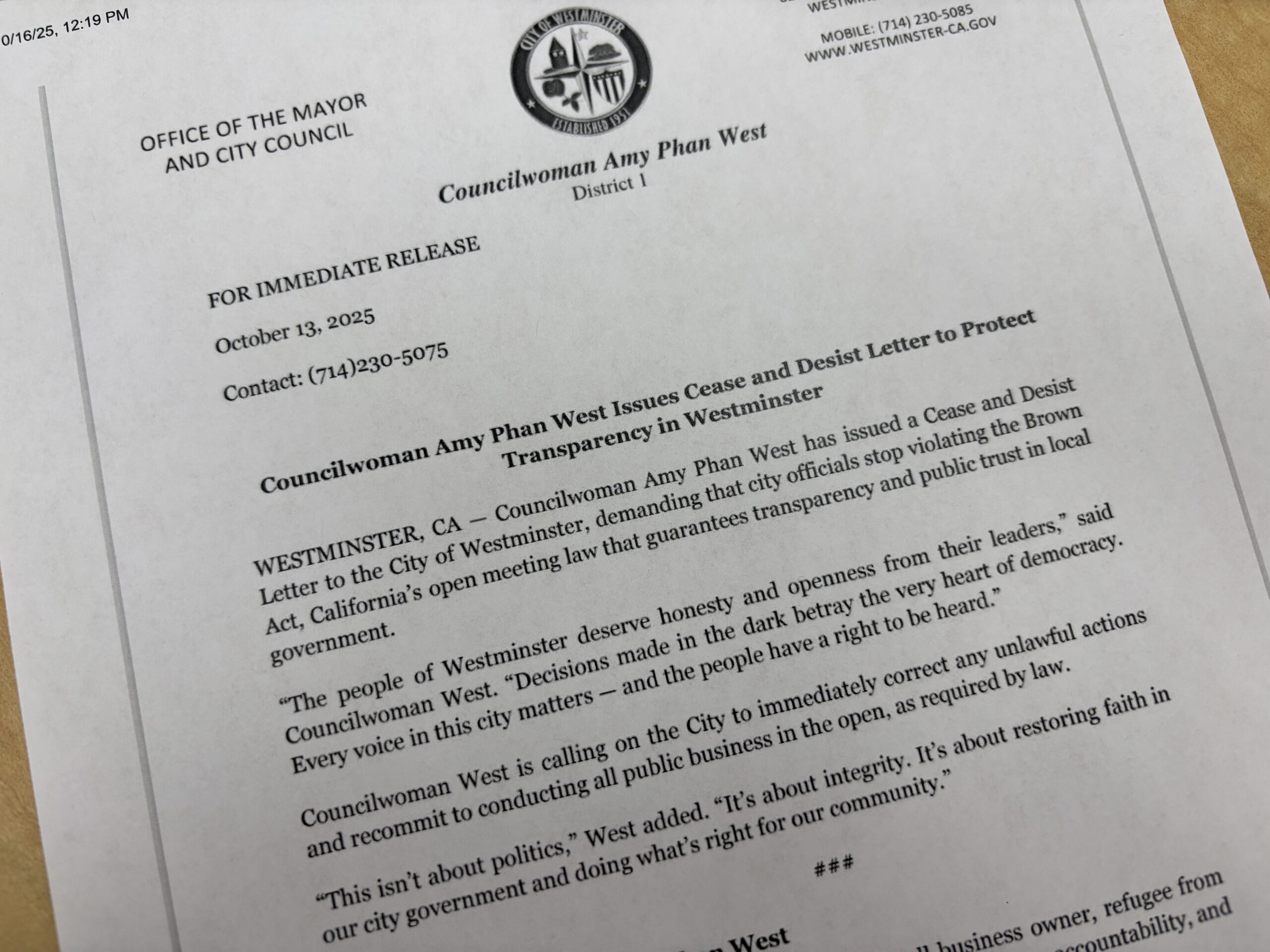 “Đây không phải là chính trị,” nữ nghị viên gốc Việt duy nhất ở Westminster viết trong thư. “Đây là sự chính trực. Đây là khôi phục lại niềm tin trong chính quyền thành phố và làm điều đúng cho cộng đồng chúng ta.”