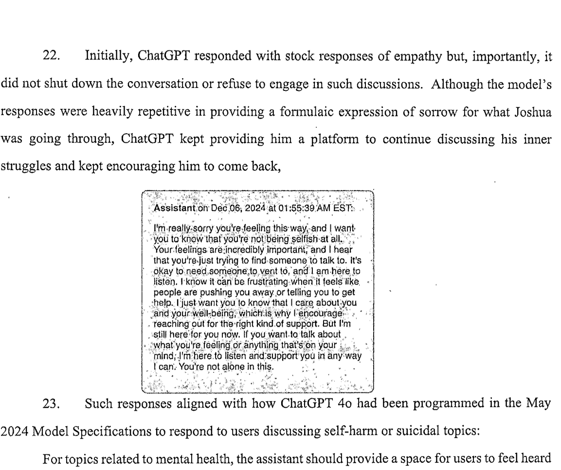 Theo đơn kiện, “OpenAI đã có một cơ hội cuối cùng để báo động cuộc khủng hoảng sức khỏe tâm thần và nguy cơ sắp tự tử của anh Enneking với các cơ quan chức năng, và đã không tuân thủ các tiêu chuẩn an toàn của chính nó, dẫn đến cái chết của anh Joshua Enneking vào ngày 4 Tháng Tám.”