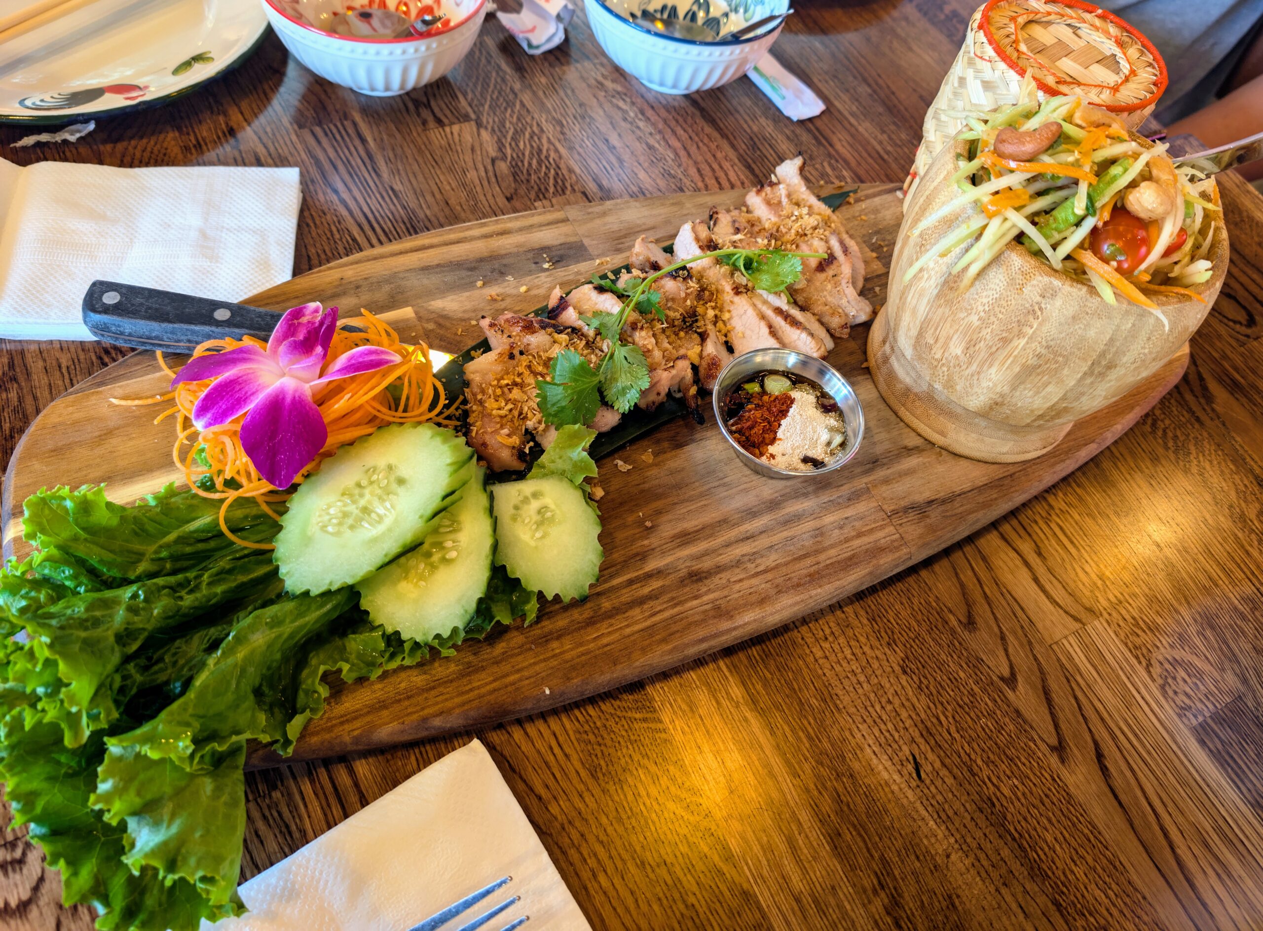 Đợi chừng 10 phút thì các món gọi được dọn ra trước, và tôi thử món thịt má heo nướng với gỏi đu đủ. Món ăn được trình bày rất đẹp vì có nhiều miếng thịt được xếp trên khay bên cạnh một chén nước chấm, còn có thêm một rổ tre đựng xôi và một cái cối đựng gỏi đu đủ.