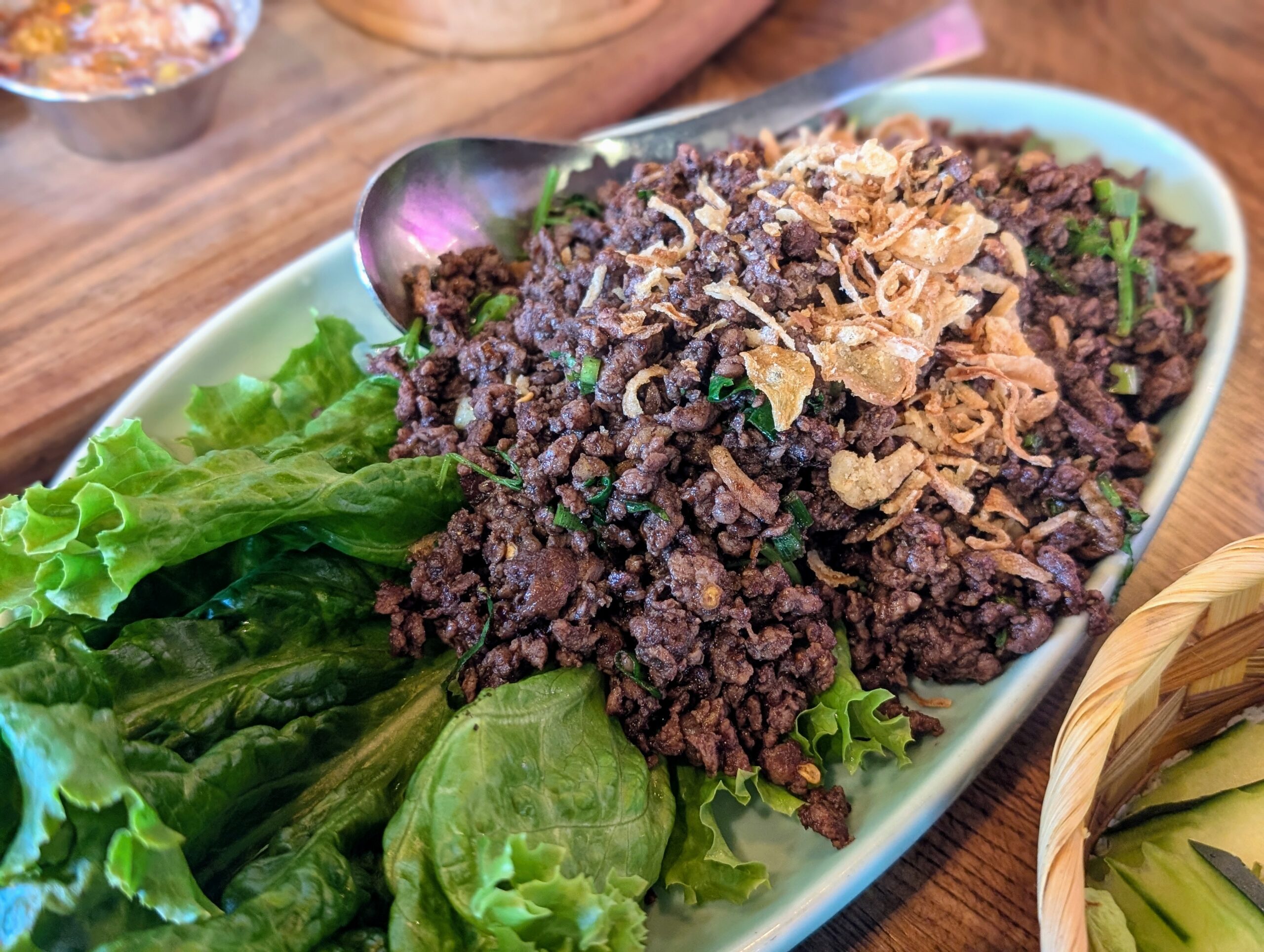 Món gỏi thịt bò được gọi là “larb” hoặc còn có cách phiên âm khác là “laab,” khác với kiểu thường thấy vì không có thịt được trộn với bột thính, chanh, ớt và nhiều gia vị khác. Món này có thịt bò được xào cháy xém với nước mắm, tỏi ớt, một số loại rau thơm và ăn cùng với hành phi.