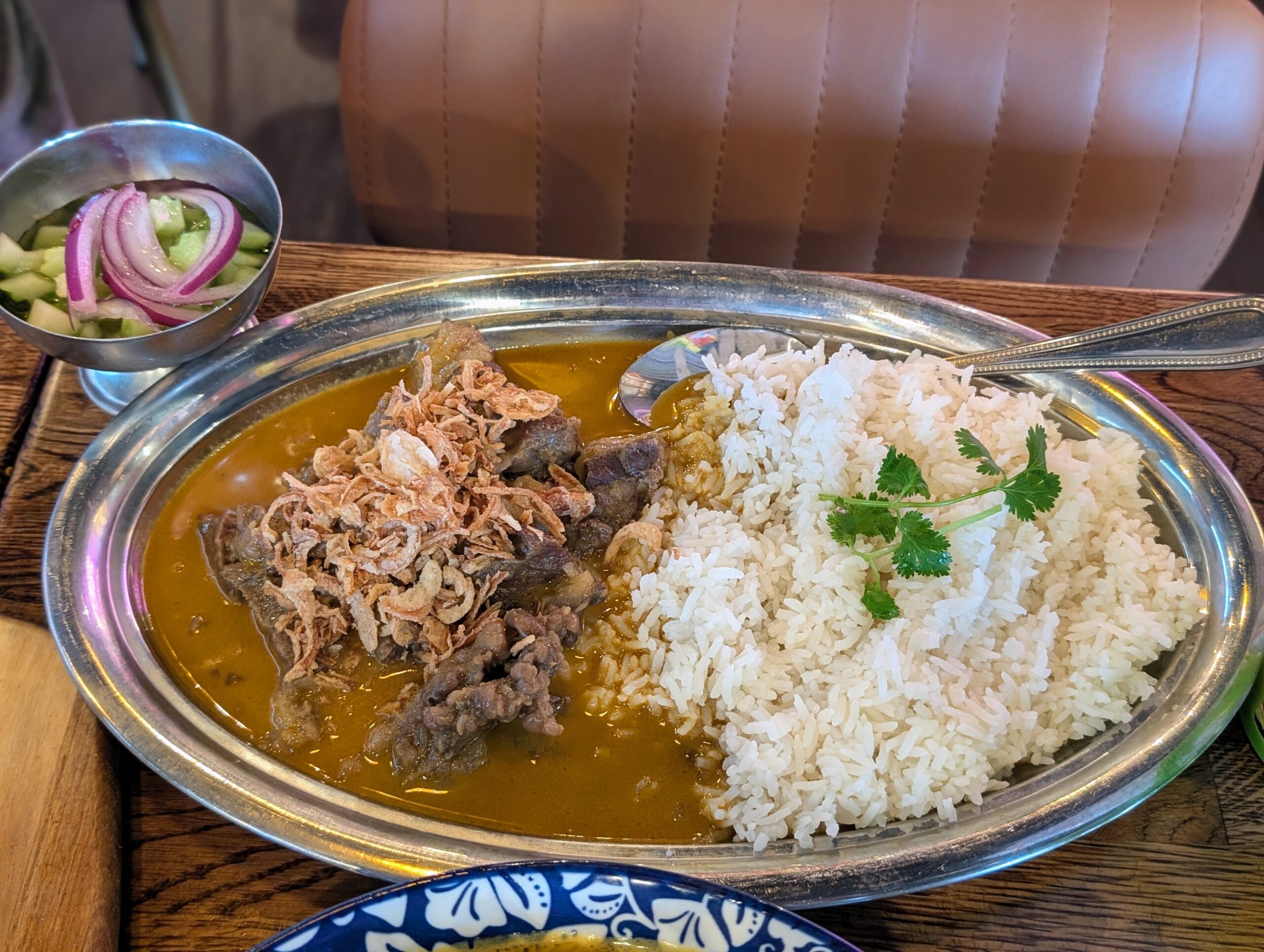 Cuối cùng là món cơm cà ri khao soi với thịt má bò, có dưa leo trộn giấm ăn kèm. Tuy sử dụng cùng loại cà ri như món mì, nhưng tôi cảm thấy nước xốt cà ri của món cơm này ít ngọt hơn, mà vẫn đậm vị béo và mùi vị cay thơm, thấm vào từng hạt cơm, làm tôi gần như không thể ngưng muỗng được.