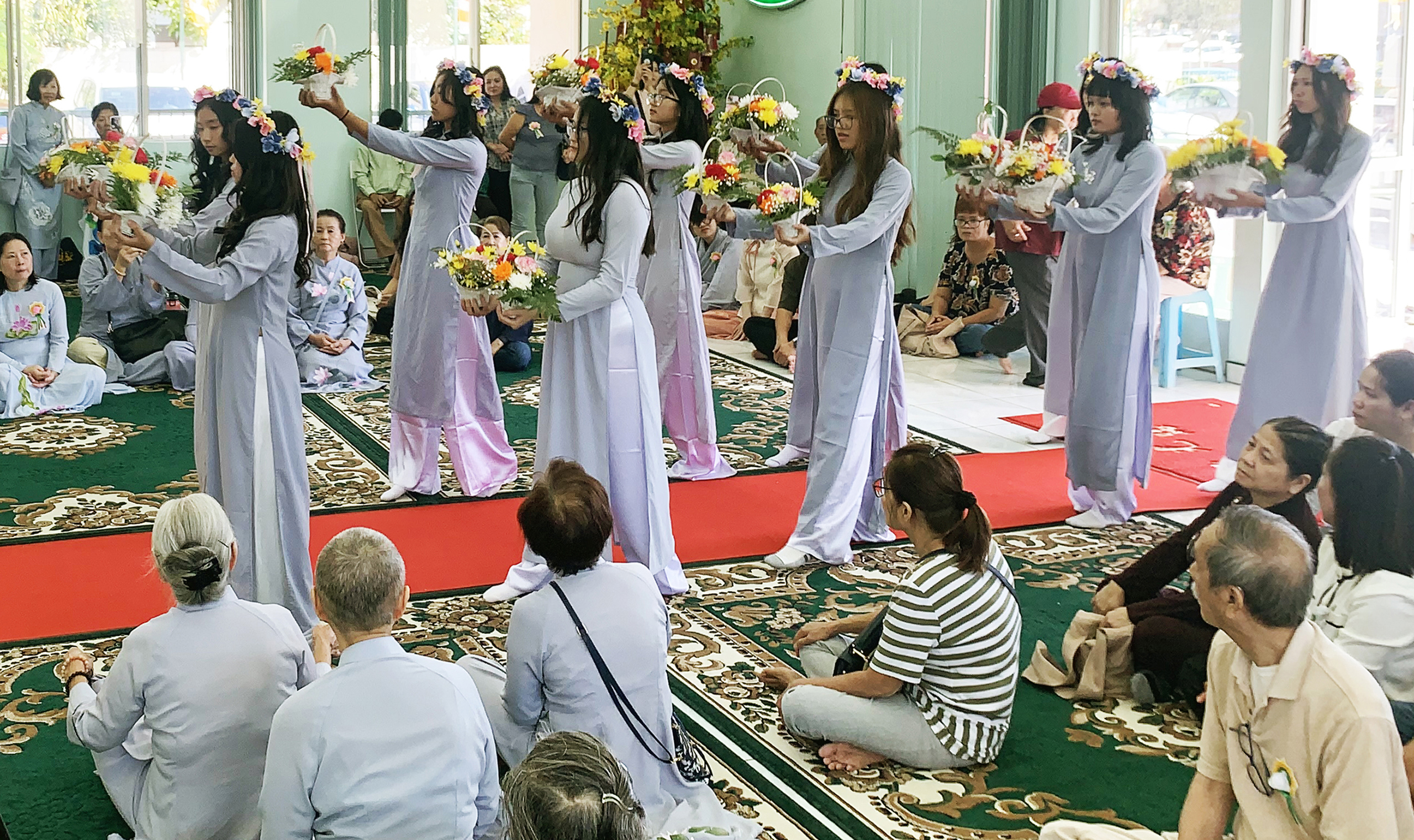 Trong Lễ Cài Hoa Hồng, các thành viên Gia Đình Phật Tử Chánh Pháp của chùa đồng hân hoan cung kính đến cài những đóa hoa hồng đỏ và trắng trên ngực áo của những bậc cha mẹ hiện tiền và đồng hương đến dự. Những đóa hoa hồng vàng thì được Phật tử cài lên áo của các ni sư. Trong khi đó, bài nhạc “Bông Hồng Cài Áo” được hát vang trong khuôn viên tổ chức.