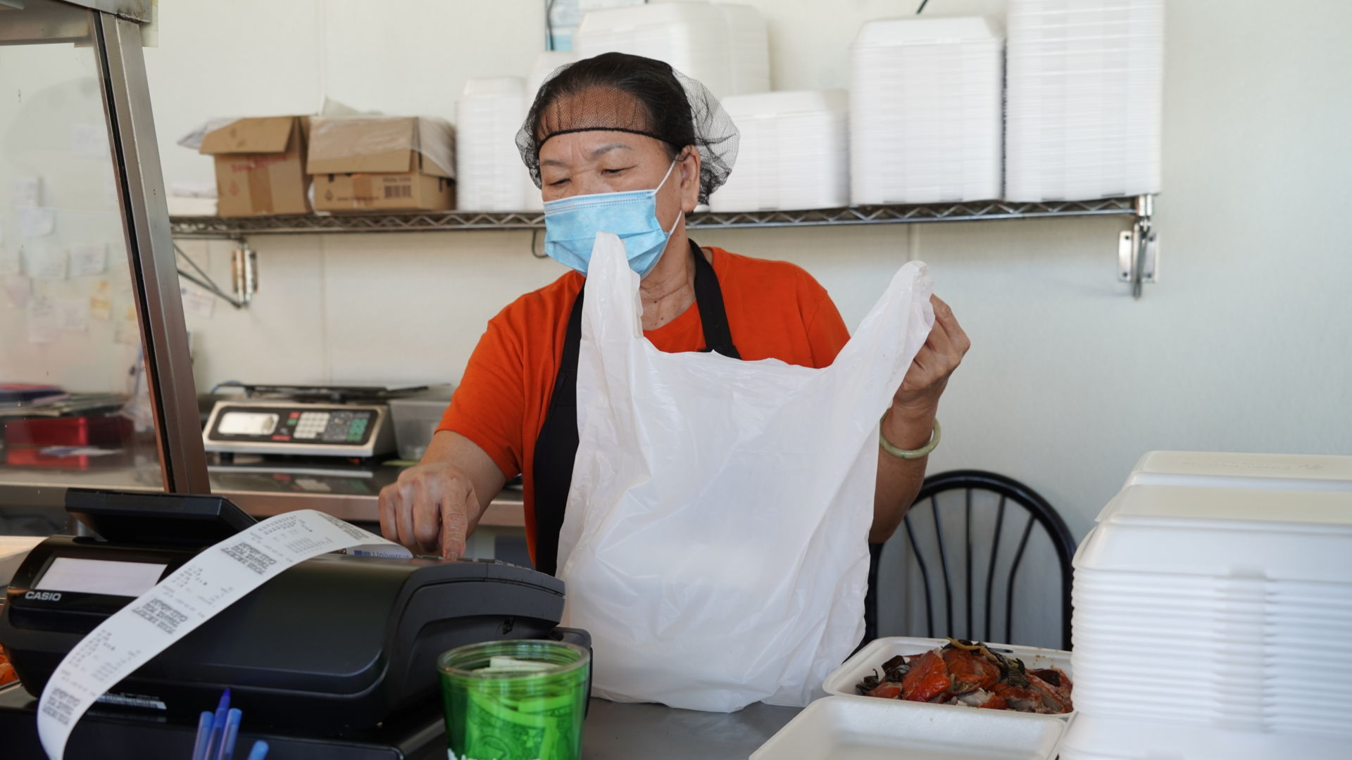 “Đó là một cực hình. Không điện, không nước. Còn gì ăn đó. Ăn khô vậy thôi. Hệ thống nước nhà tôi bị bể. Cho đến ngày hôm qua mới sửa xong,” bà Phước vừa nói vừa gói hộp thịt quay cho khách.