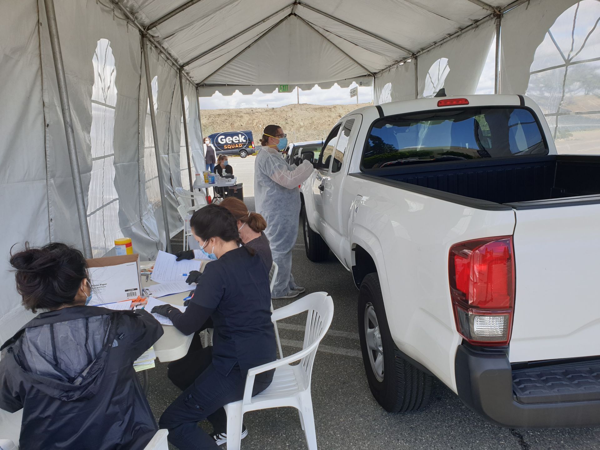 “Thật khó mà nói chính xác mỗi xe phải đợi bao lâu thì mới vào đến lều thử nghiệm. Tôi đoán rằng người ta phải đợi từ ba đến bốn tiếng rưỡi là ít,” cô Julie Carr, một chuyên viên thử nghiệm, nói với phóng viên nhật báo Người Việt. “Chúng tôi mở cửa từ 9 giờ sáng đến 5 giờ chiều.”