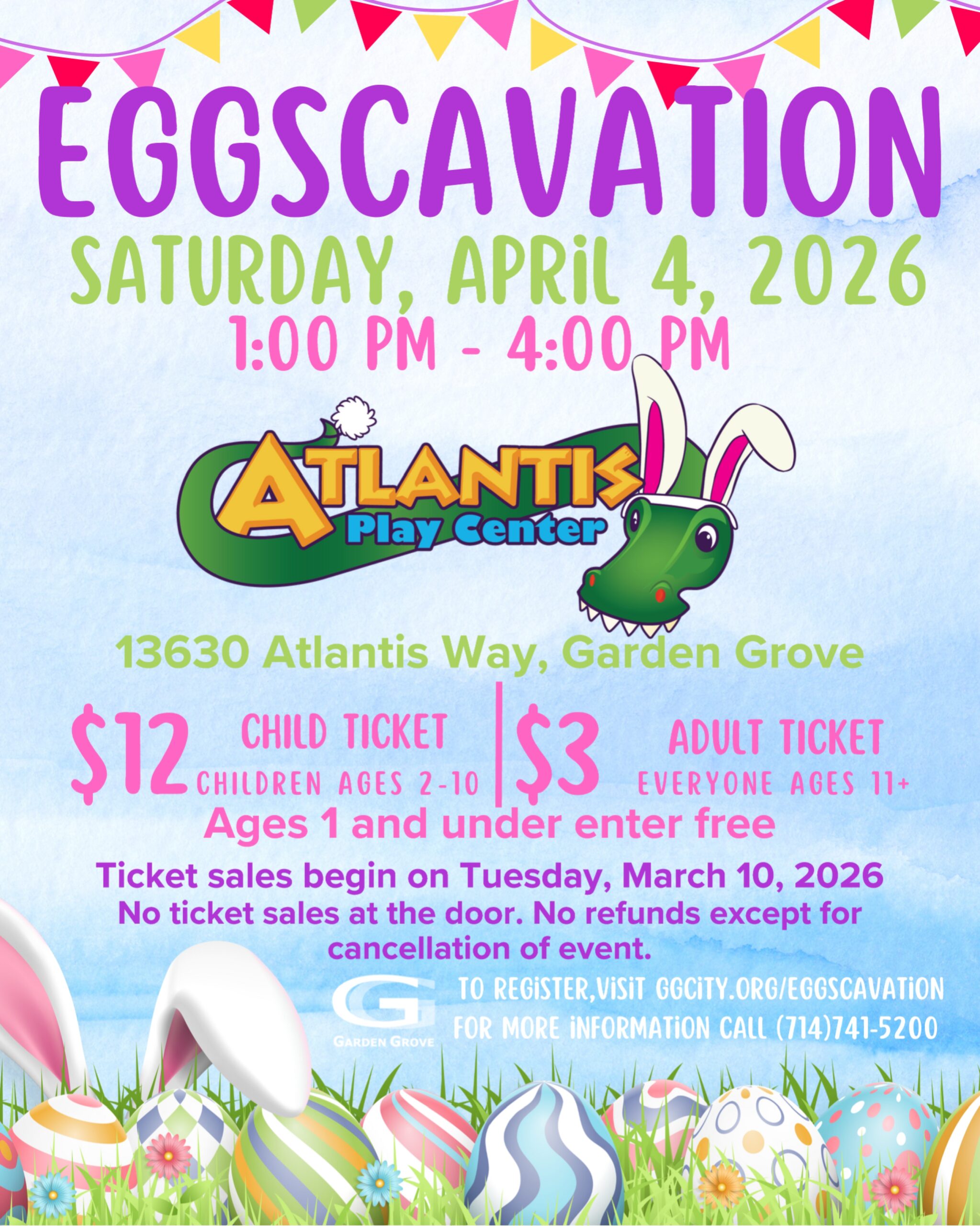 GARDEN GROVE, California (NV) – Garden Grove sẽ tổ chức Chương Trình Lượm Trứng (Eggscavation) nhân dịp Phục Sinh (Easter) cho trẻ em từ 1 giờ trưa đến 4 giờ chiều Thứ Bảy, 4 Tháng Tư, tại Trung Tâm Atlantis Play Center, 13630 Atlantis Way, Garden Grove, CA 92844 (phía sau công viên Garden Grove) vào , thông cáo báo chí của thành phố gởi ra hôm Thứ Ba, 10 Tháng Ba, cho biết.