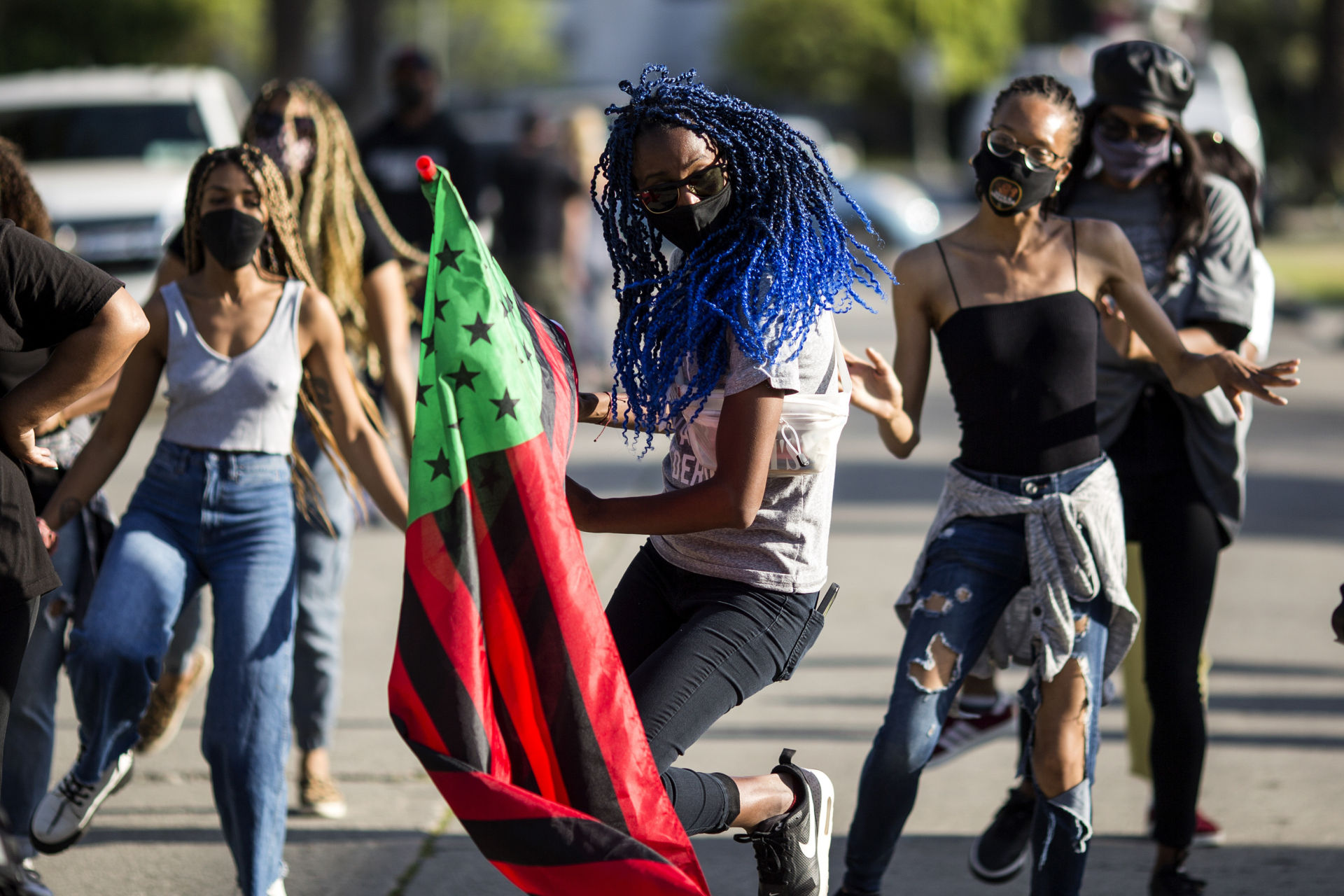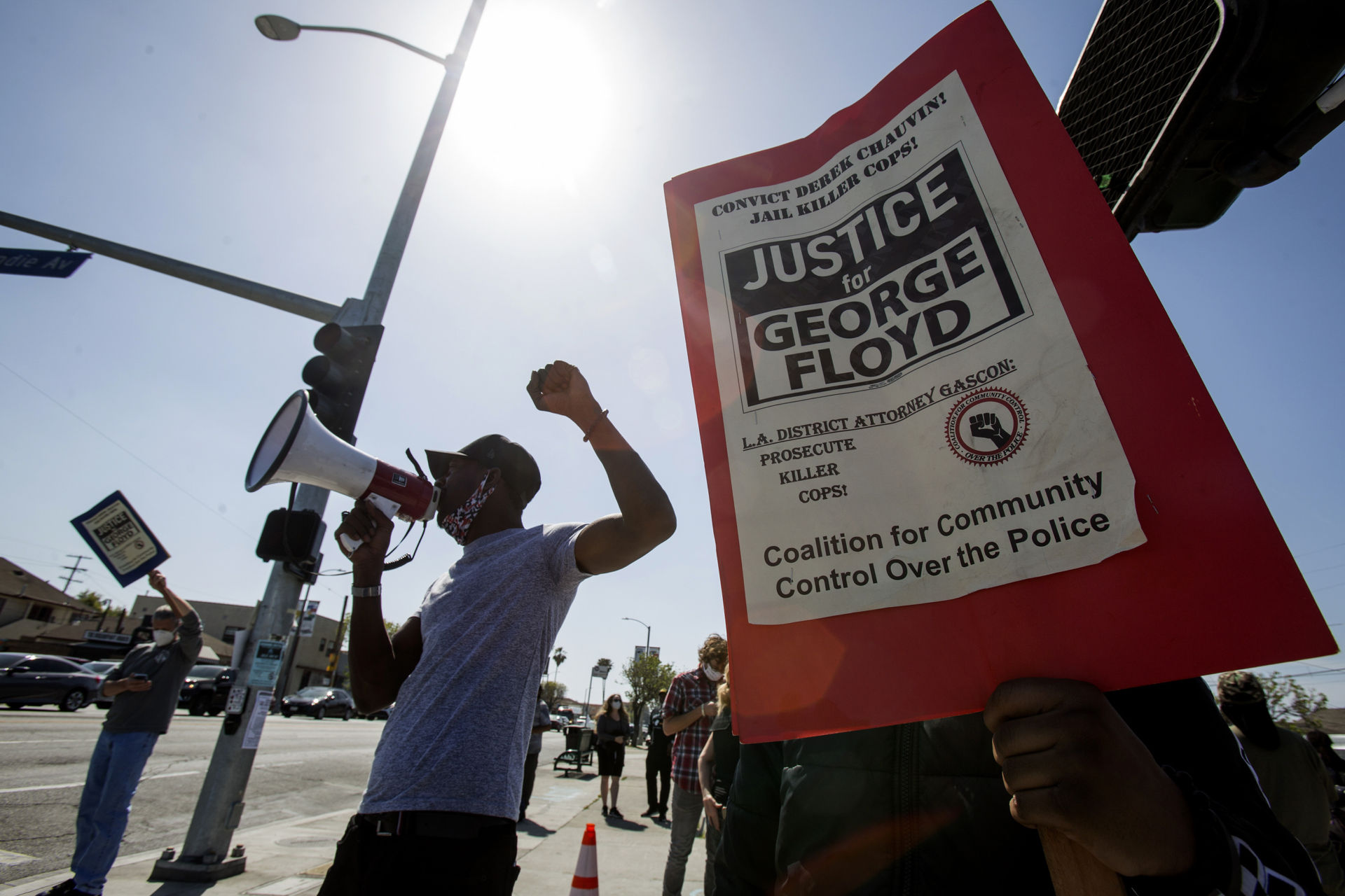 Vào cuối buổi chiều, một nhóm khác tụ tập ở góc đường Florence và Normandie vẫy áp phích. Xe cộ chạy ngang bấm còi. Nhiều tấm áp phích đòi công lý cho ông Floyd được dán gần đó.