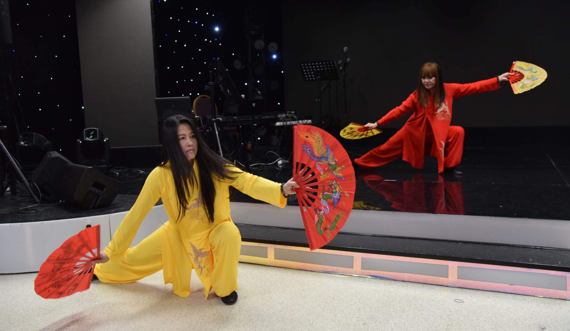 Không khí ngày càng nồng ấm hơn khi những học viên vỗ tay tán thưởng nhiệt liệt màn trình diễn múa quạt của 2 học viên xinh đẹp, ca sĩ Hương Thơ và xướng ngôn viên An Miên, rất dũng mãnh nhưng không kèm phần lả lướt như những cánh bướm vờn hoa, đó cũng là công phu luyện tập về mặt nội lực đã đạt được của học viên qua quá trình luyện tập Trường Sinh Học.