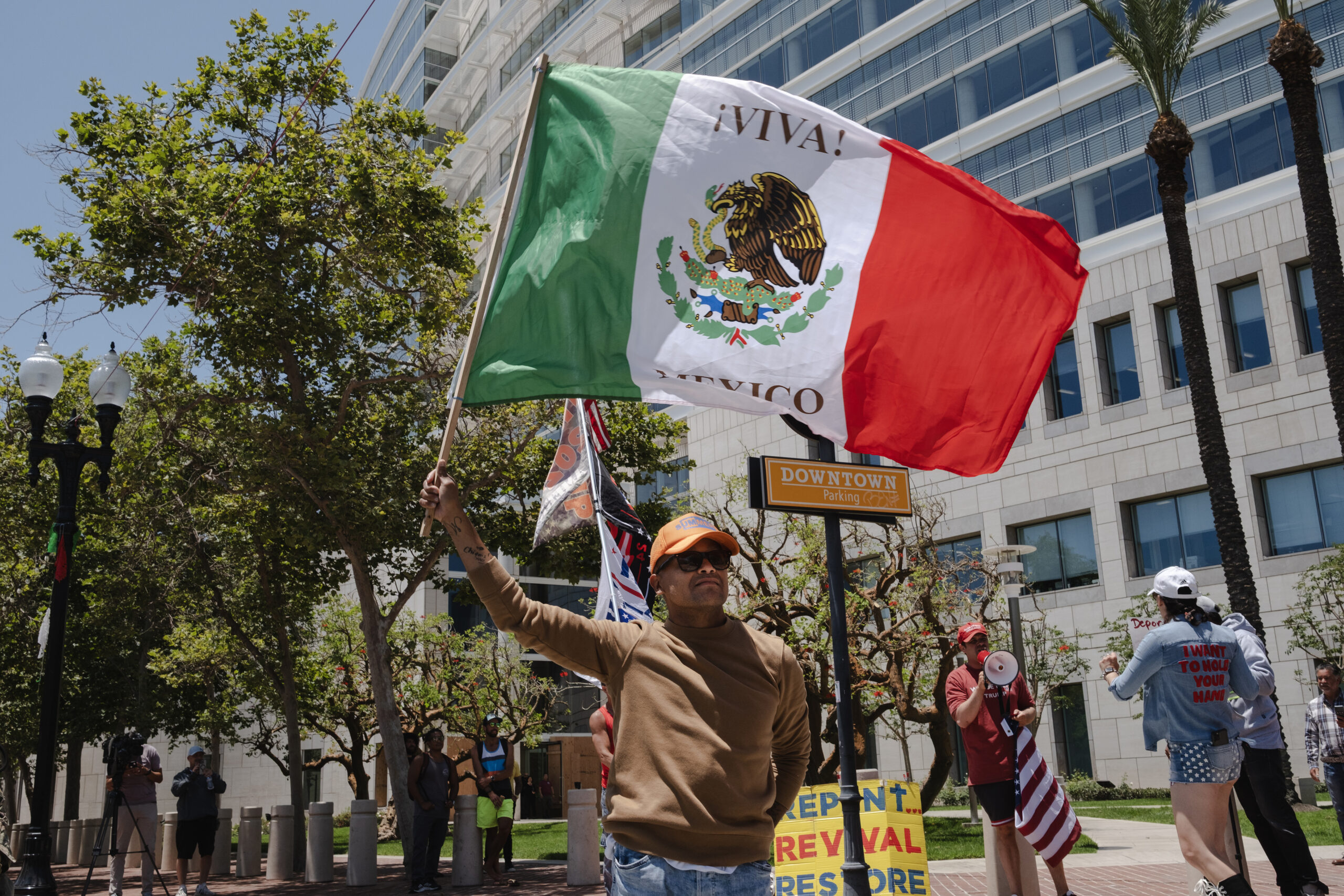 Một ông vẫy cờ Mexico phía trước nhóm người biểu tình ủng hộ Tổng Thống Donald Trump ở Santa Ana, California, hôm 10 Tháng Sáu. (Hình minh họa: Jim Vondruska/Getty Images)