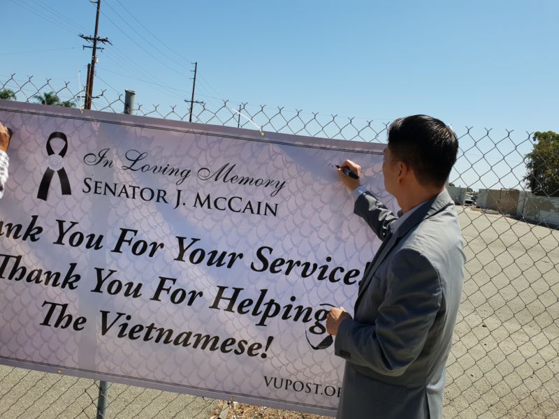 Biểu ngữ màu trắng, có hàng chữ đen “In Loving Memory Senator J. McCain. Thank You for Your Service! Thank You for Helping the Vietnamese!”