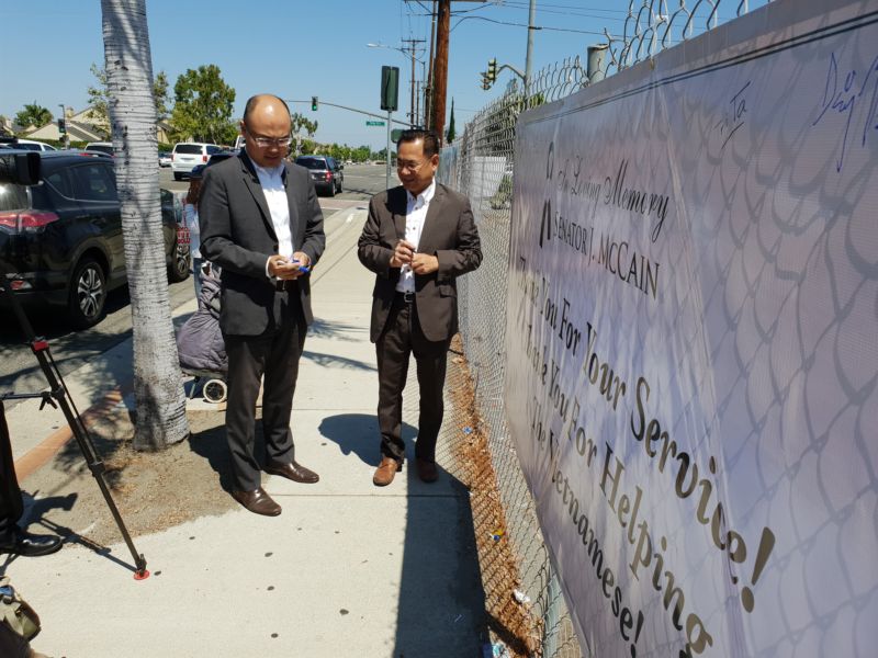 Ông Trí Tạ, thị trưởng thành phố Westminster, vừa cùng mọi người căng biểu ngữ, vừa nói: “Cộng đồng mình có rất nhiều chịu ơn ông McCain, trong đó có gia đình tôi. Nên so với công ơn của ông đối với bao nhiêu người, việc làm của chúng tôi không đáng là bao, nhưng mình phải làm để nói lên lòng mình.”