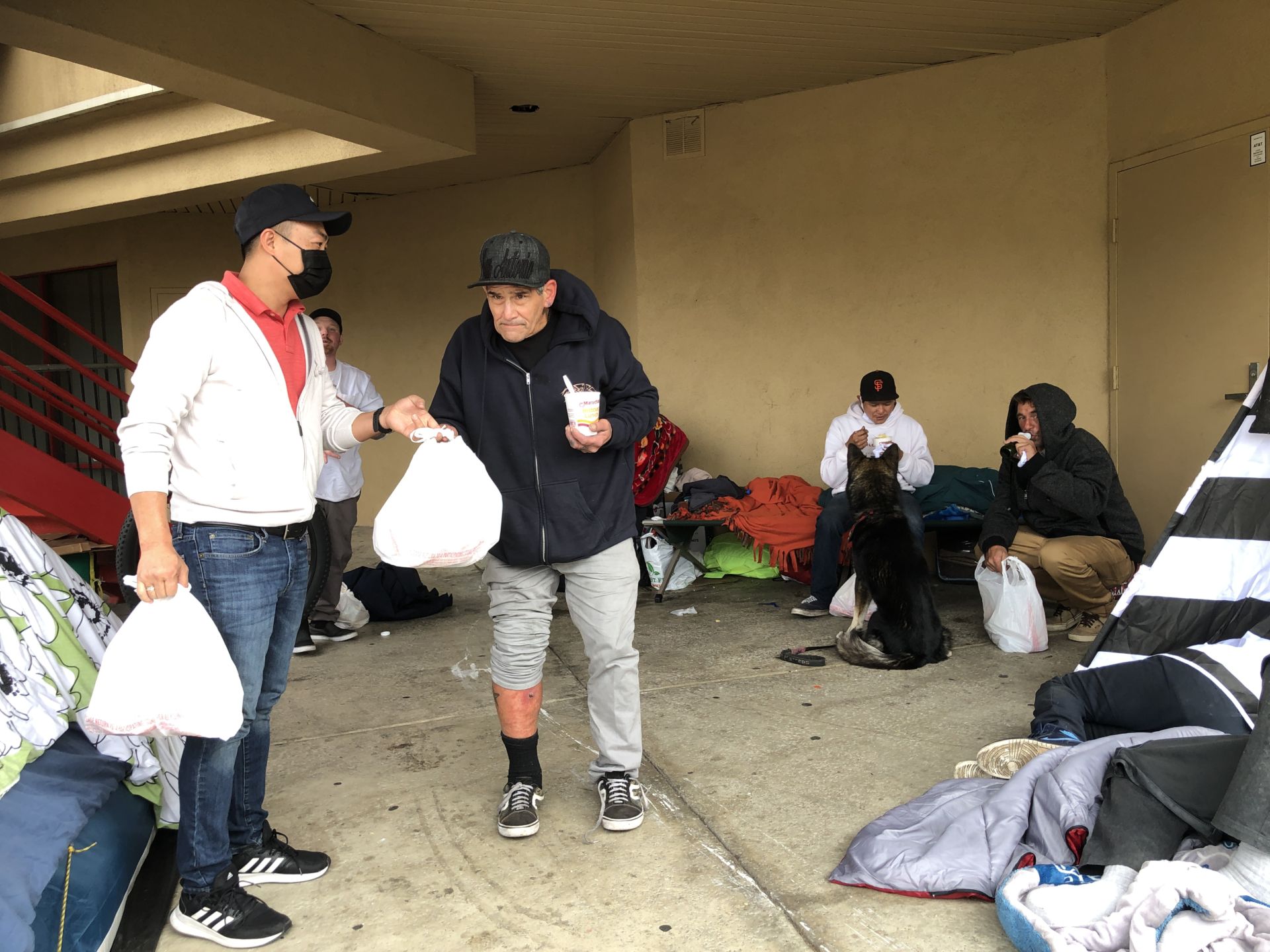 Anh Huy Hồ (bìa trái) đem từng gói quà đến trao tay từng người vô gia cư. (Hình: Đoan Trang/Người Việt)