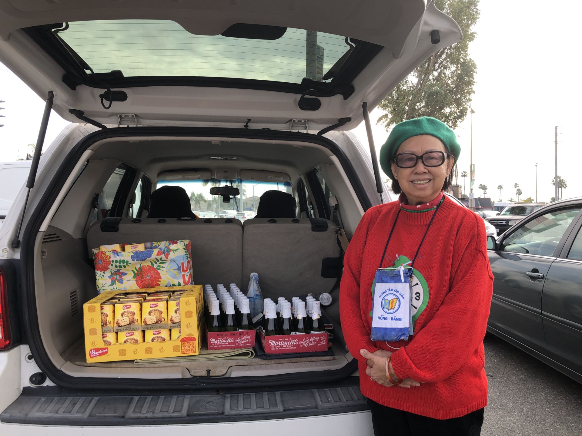 Bà Ngọc Huỳnh bên chiếc xe chở quà của mình đến phụ ông John Nguyễn tặng người vô gia cư. (Hình: Đoan Trang/Người Việt)