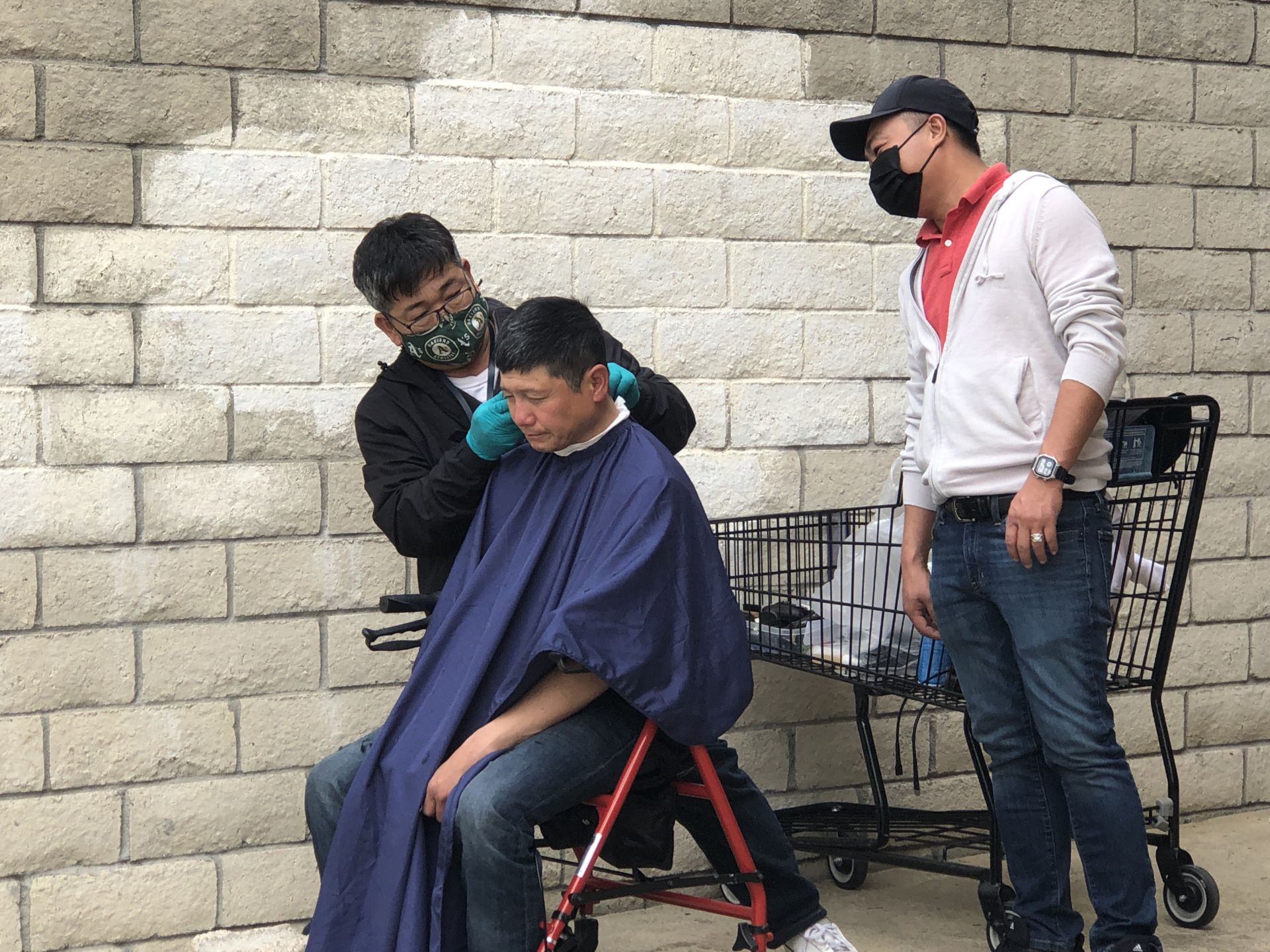 Anh Andy Phạm cắt tóc cho một ông vô gia cư. (Hình: Đoan Trang/Người Việt)