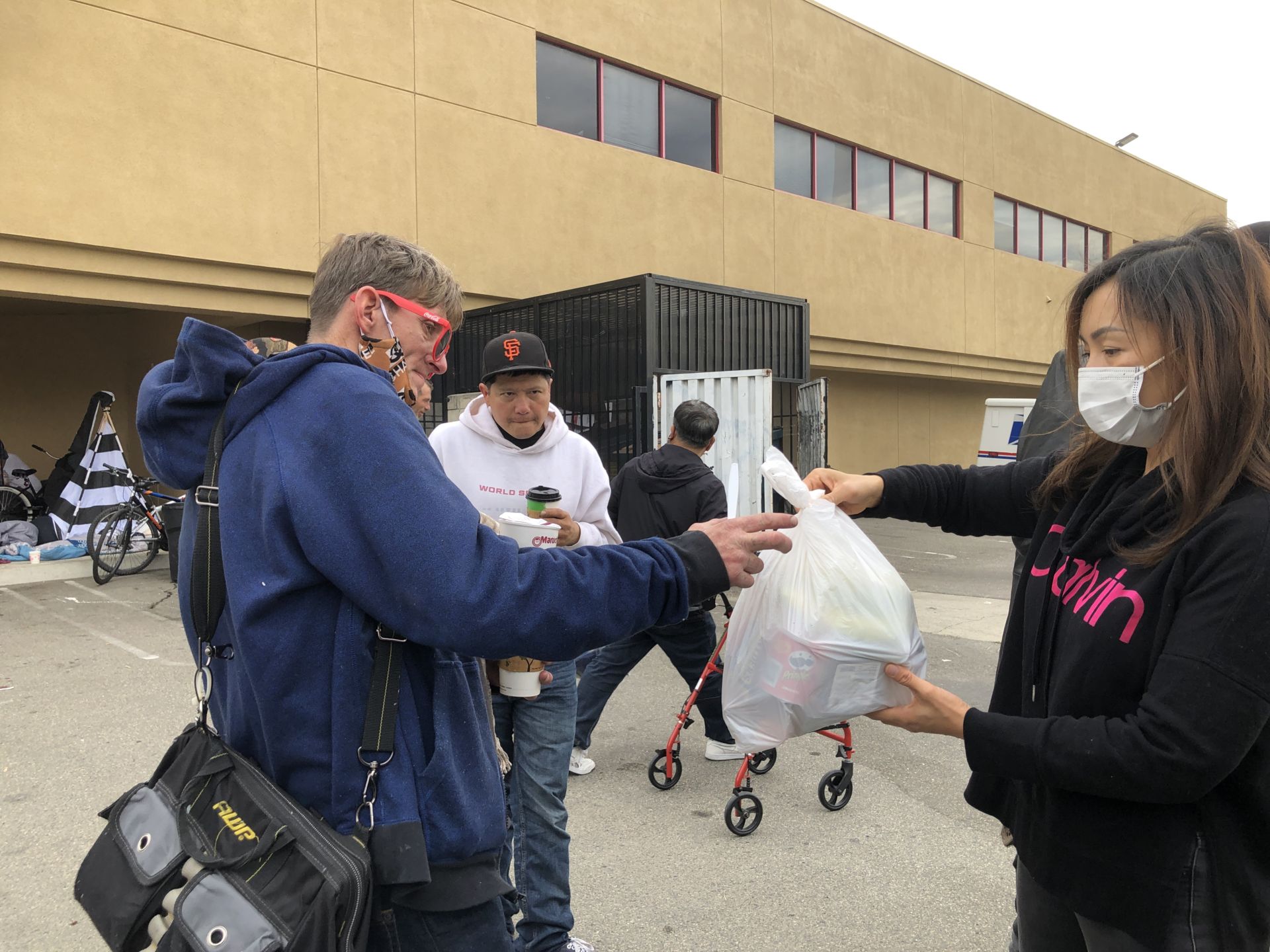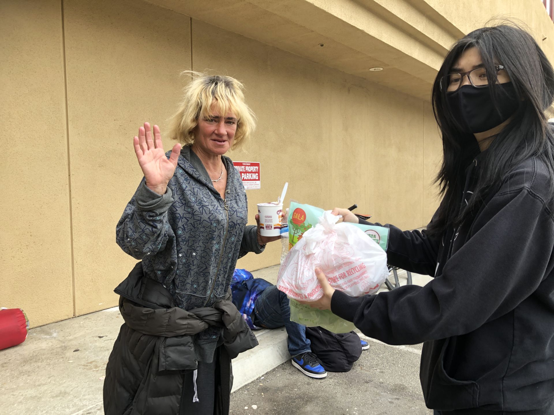 Em Christine Nguyễn tất bật đem mì đến từng người, rồi tặng quà cho các cô chú vô gia cư. (Hình: Đoan Trang/Người Việt)