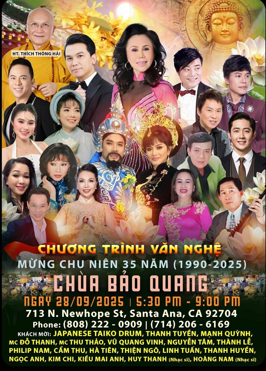 Chương trình văn nghệ mừng Chu Niên 35 năm (1990-2025) sẽ diễn ra tại khuôn viên chùa ở địa chỉ 713 N. Newhope St., Santa Ana, CA 92704, vào Chủ Nhật, 28 Tháng Chín, từ khoảng 5 giờ 30 phút chiều tới 9 giờ tối.