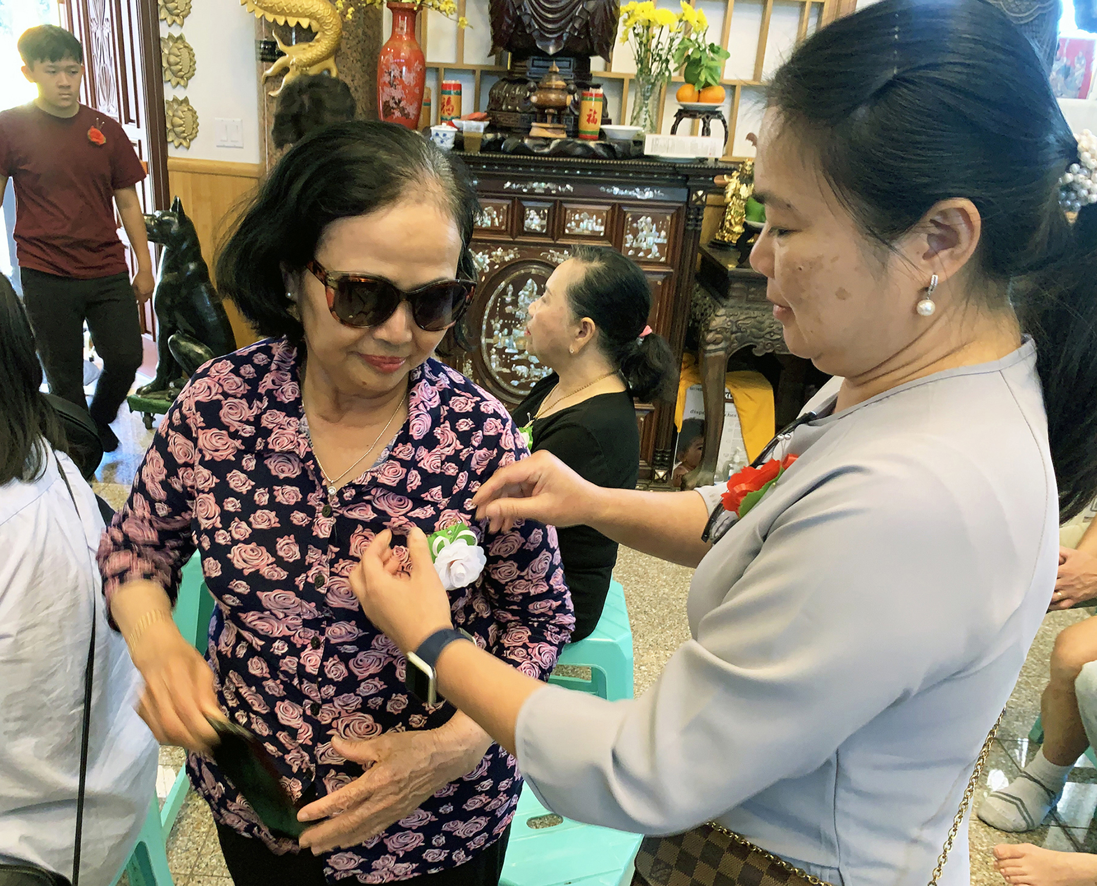 Phật tử Nhật Châu được cài hoa hồng đỏ. Cô tâm tình: “Tôi được hân hạnh đón nhận hoa hồng đỏ trong hôm nay, vì tôi còn cha mẹ. Nhưng đôi khi mình cũng có lúc làm cho cha mẹ buồn. Nhưng lúc nào họ cũng thương yêu và tha thứ tôi.”