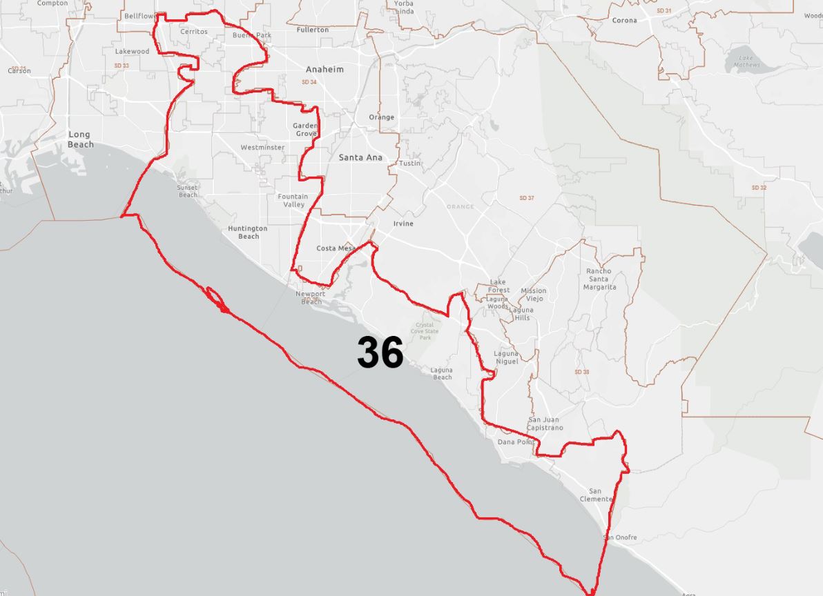 Địa Hạt 36 bao gồm các cộng đồng nằm sát bờ biển, từ ranh giới Orange County và Los Angeles County chạy xuống tận ranh giới San Diego County, và đặc biệt, bao gồm toàn bộ vùng Little Saigon, nơi có cộng đồng người Việt lớn nhất hải ngoại.