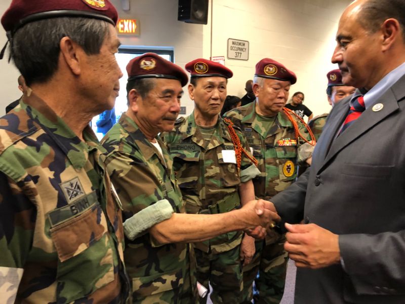 Dân Biểu Correa nhìn về phía các hàng ghế nơi các cựu quân nhân Mỹ gốc Việt mang quân phục thuộc các quân binh chủng QLVNCH.