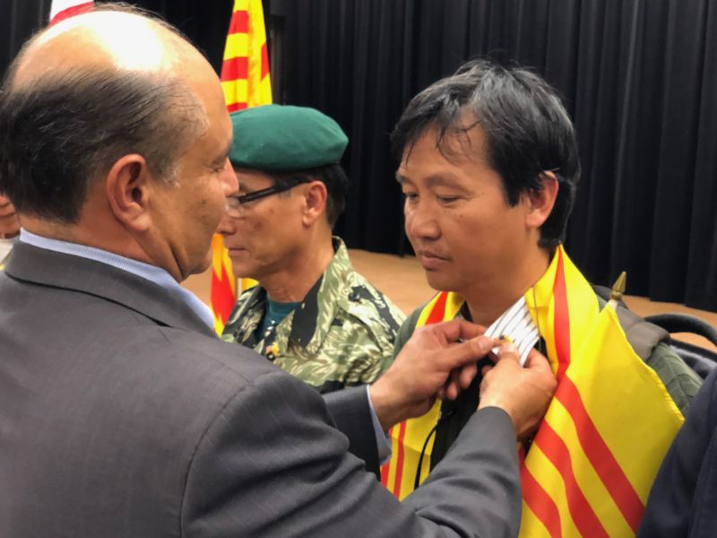 Một người là nữ Nghị Viên Thu-Hà Nguyễn của Hội Đồng Thành Phố Garden Grove. Cô nhận huy hiệu thay cho người cha nuôi là cựu đại úy Thủy Quân Lục Chiến Nguyễn Phục Hưng, vắng mặt vì bận đi làm.