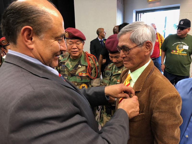 Sau đó, các cựu quân nhân Mỹ rời từng hàng ghế để lên nhận huy hiệu do Dân Biểu Correa trang trọng gắn lên áo của họ với sự trợ giúp của cô Jessica Min, 19 tuổi, một nữ sinh trung học, được ông đề cử vào Trường Võ Bị West Point của Hoa Kỳ hồi năm ngoái và sẽ nhập trường vào Tháng Sáu.