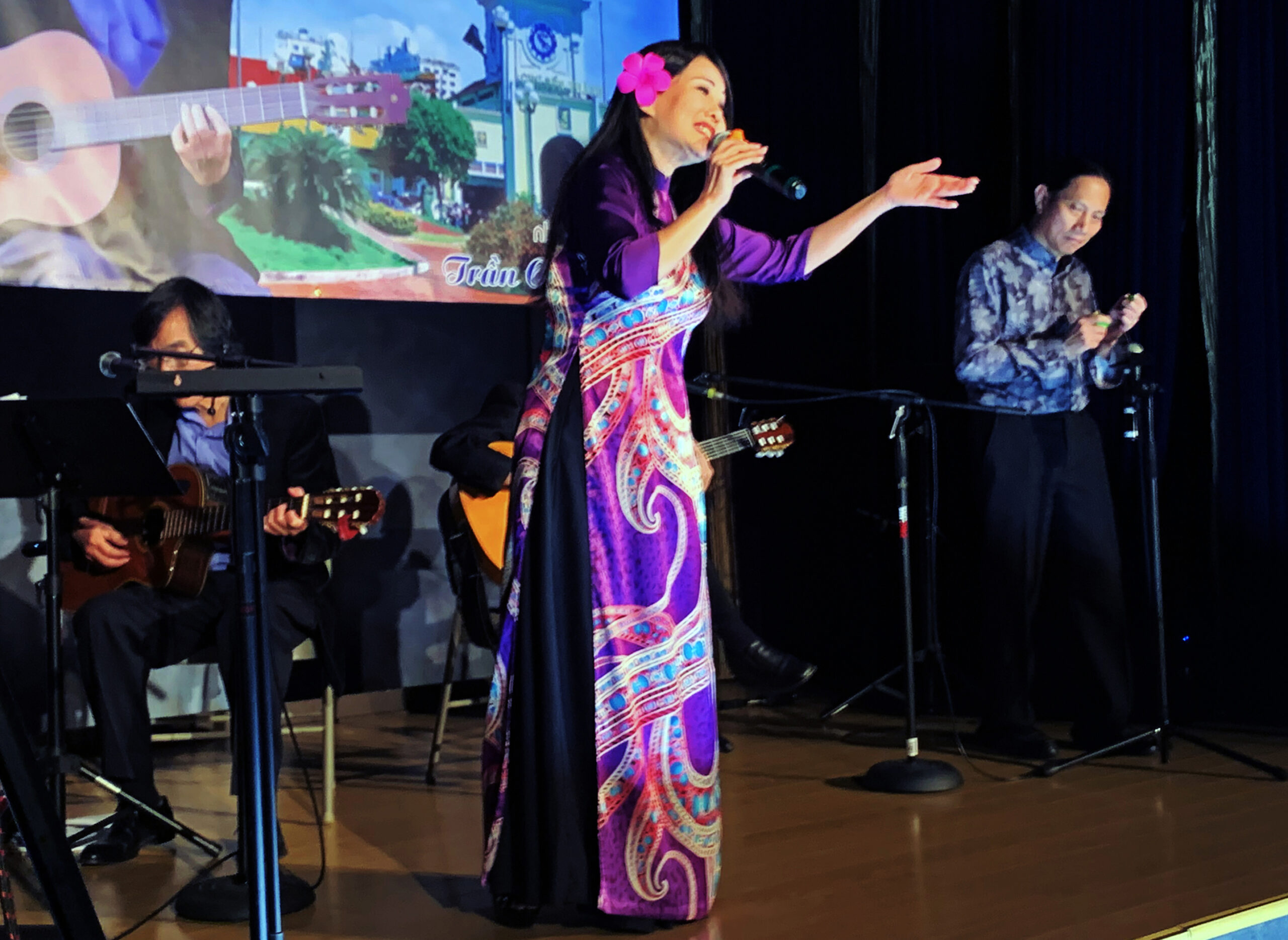 Ca sĩ Thúy Anh hát bài “Tà Áo Dài Quê Hương.” (Hình: Lâm Hoài Thạch/Người Việt)