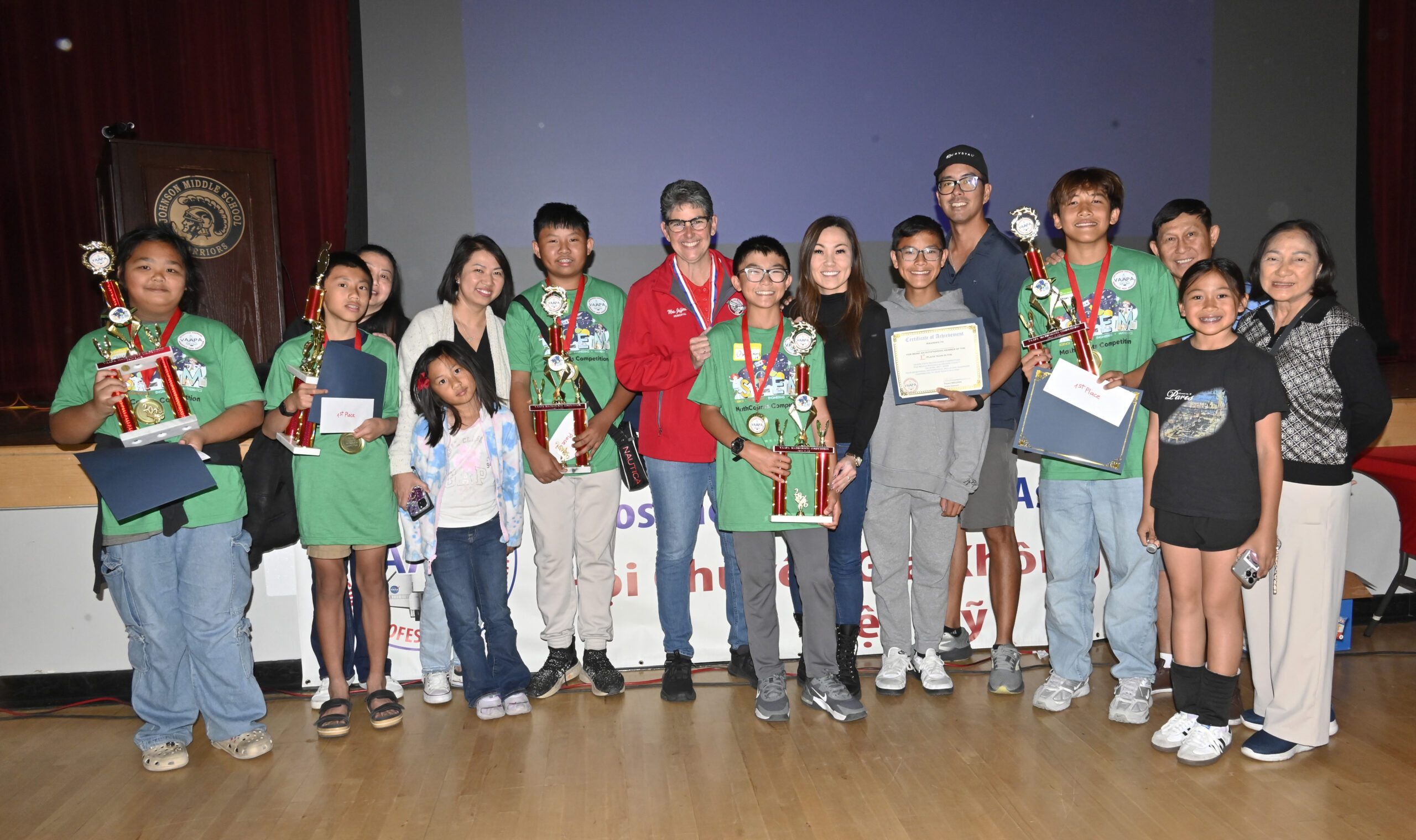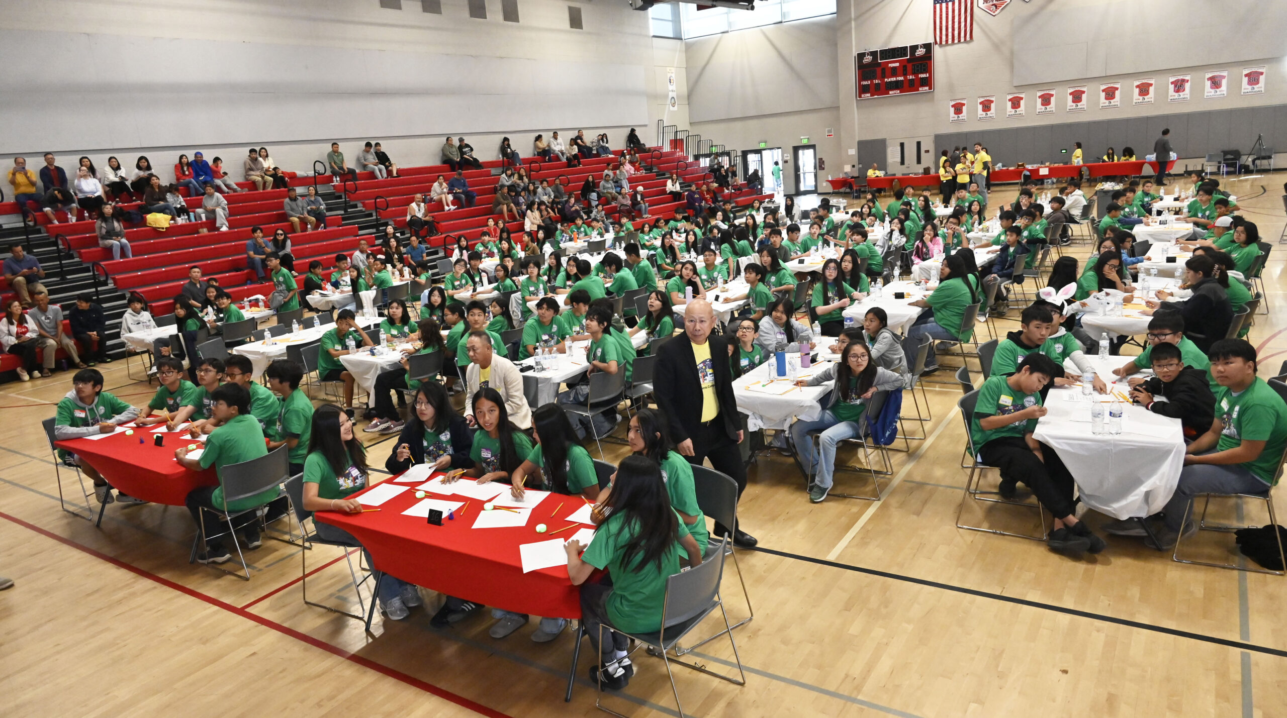 Trong khán phòng rộng lớn, các thí sinh được chia thành nhiều đội theo độ tuổi và cấp lớp học, dưới sự điều khiển của thầy Joseph Nguyễn, cô CatLinh Nguyễn, và cô Kiarra Garcia.