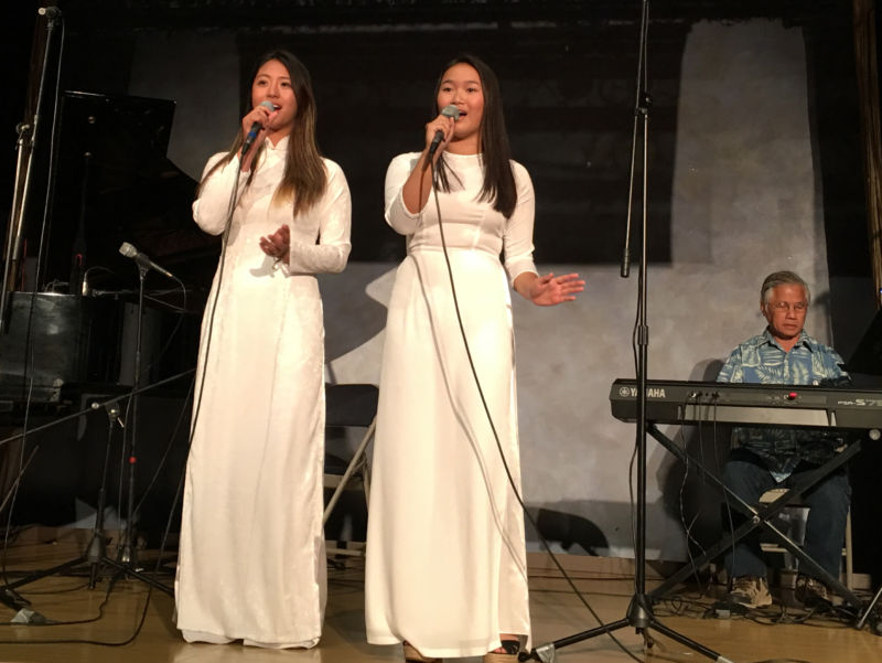 Hai em Tâm Như và Amy duyên dáng khi thể hiện ca khúc “Một thoáng quê hương” của nhạc sĩ Từ Huy. (Hình: Trúc Linh/Người Việt)
