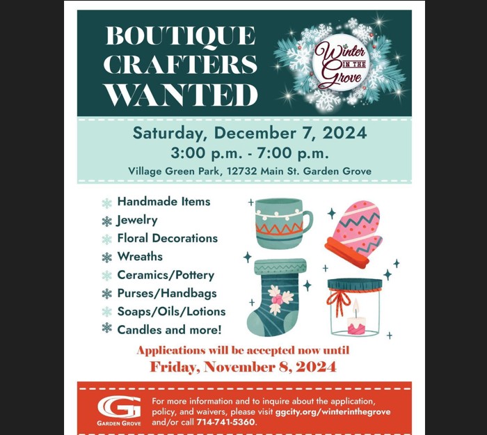 GARDEN GROVE, California (NV) – Garden Grove bắt đầu cho thuê gian hàng bán đồ thủ công tại sự kiện “Winter in the Grove,” diễn ra từ 3 giờ chiều đến 7 giờ tối Thứ Bảy, 7 Tháng Mười Hai, tại Village Green Park, 12730 Main Street, Garden Grove, CA 92840, thông cáo báo chí của thành phố đưa ra hôm Thứ Năm, 18 Tháng Chín, cho biết.