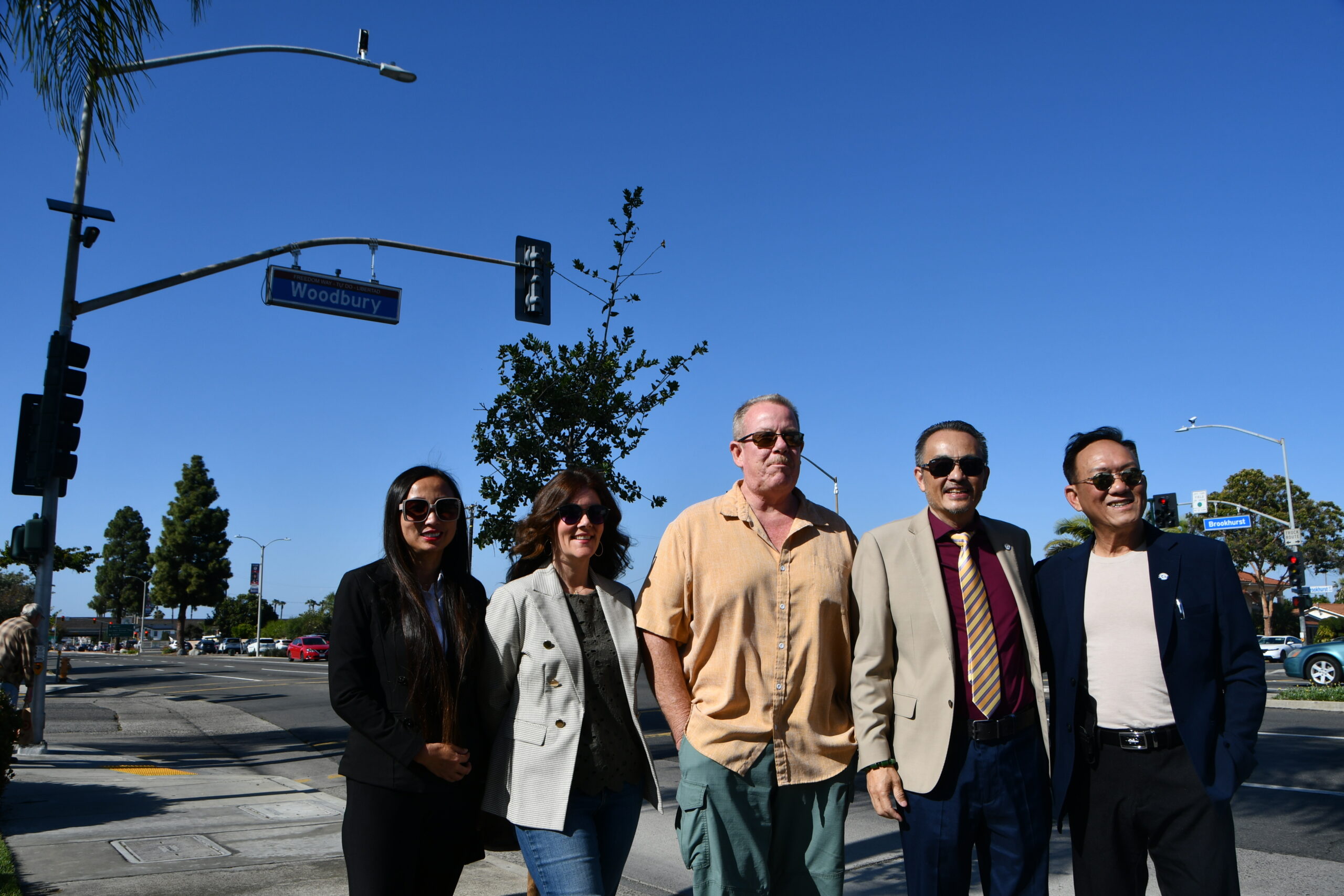 Một số dân cử của Garden Grove cùng các nhân viên thành phố có mặt tại góc đường Brookhurst với đường Traylor/Woodbury để khai trương bảng tên đường mới và chia sẻ niềm vui.