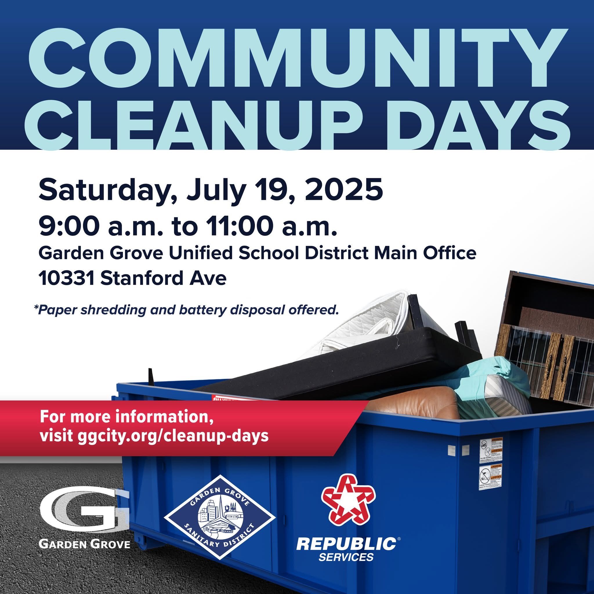 GARDEN GROVE, California (NV) – Garden Grove, hợp tác với Đặc Khu Vệ Sinh Garden Grove Sanitary District và công ty Republic Services, sẽ tổ chức Ngày Dọn Dẹp Cộng Đồng (Community Cleanup Day) để cư dân mang bỏ những đồ cồng kềnh (bulky item) miễn phí đúng cách, thông báo của thành phố cho biết.