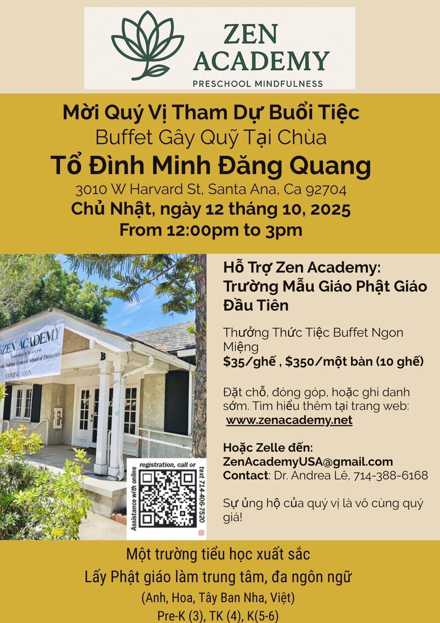 SANTA ANA, California (NV) – Buổi tiệc chay gây quỹ xây dựng Zen Academy sẽ được tổ chức từ 12 giờ trưa đến 3 giờ chiều Chủ Nhật, 12 Tháng Mười, tại Tổ Đình Minh Đăng Quang, 3010 W.Harvard St, Santa Ana, CA 92704.