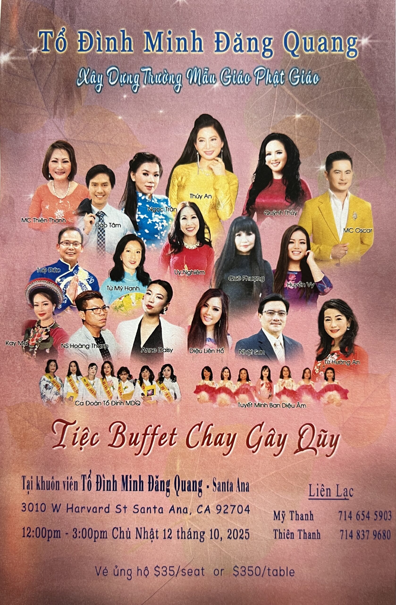 Buổi tiệc chay gây quỹ với tiệc buffet thanh khiết, và thưởng thức chương trình văn nghệ do các ca sĩ đóng góp. Tổ Đình Minh Đăng Quang mời đồng hương Phật tử ủng hộ.