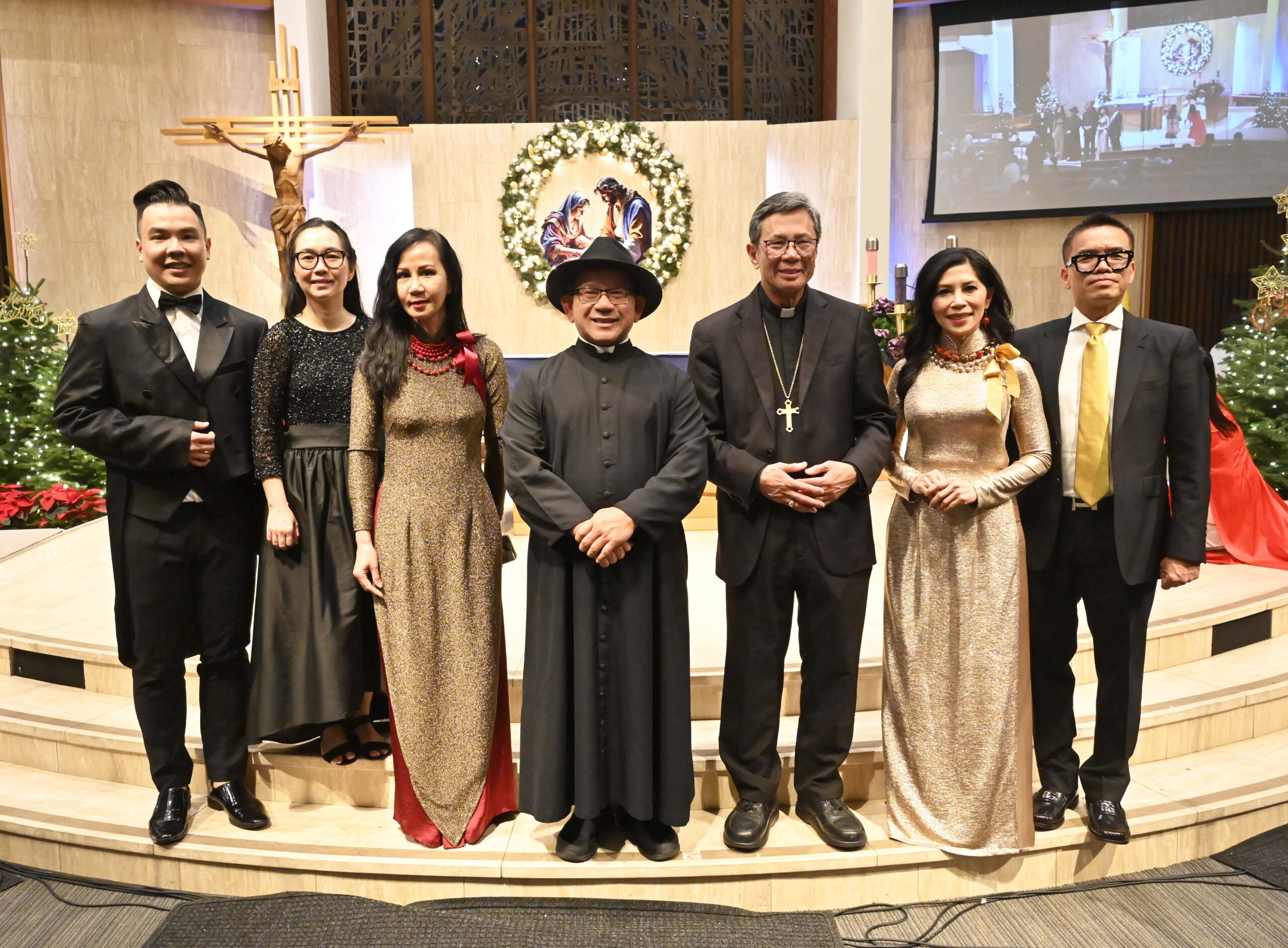 Từ trái, nhạc trưởng Nguyễn Minh Khoa, nhạc trưởng Trần Bạch Đằng, MC Đoàn Vi Hương, Linh Mục Phạm Ngọc Hùng, Giám Mục Nguyễn Thái Thành (giám mục phụ tá Giáo Phận Orange), MC Mộng Huyền, và MC Vũ Đạt tại Đêm Thánh Nhạc “Hồng Ân 2” mừng Giáng Sinh. (Hình: Văn Lan/Người Việt)
