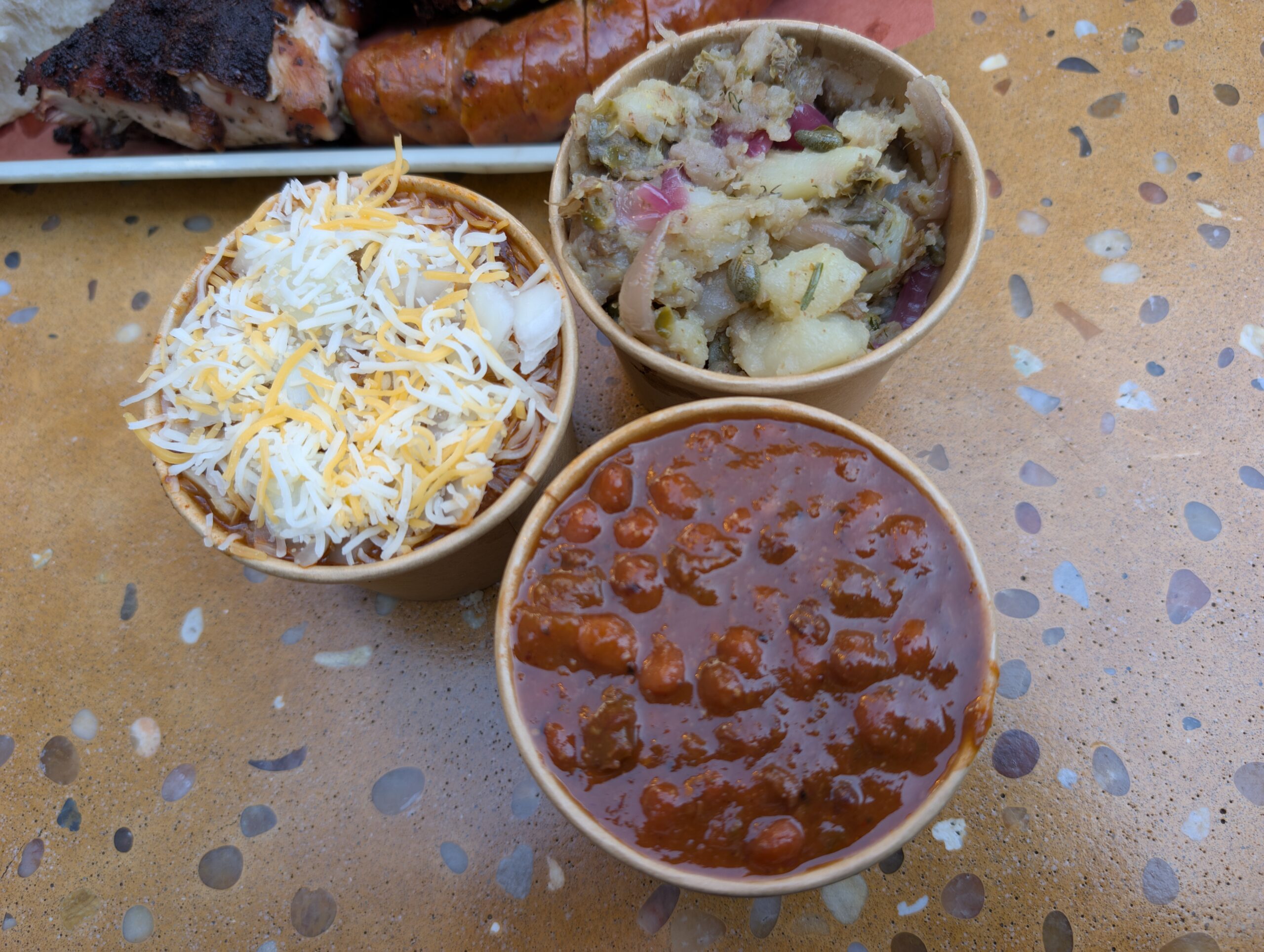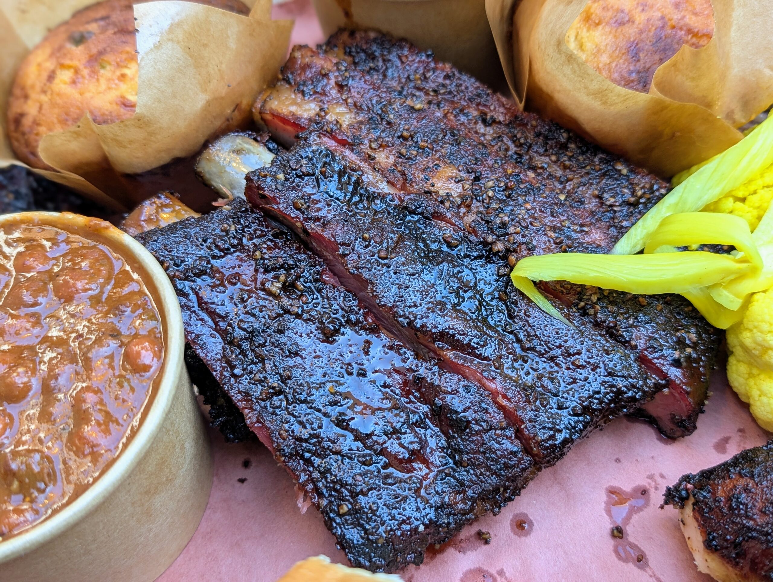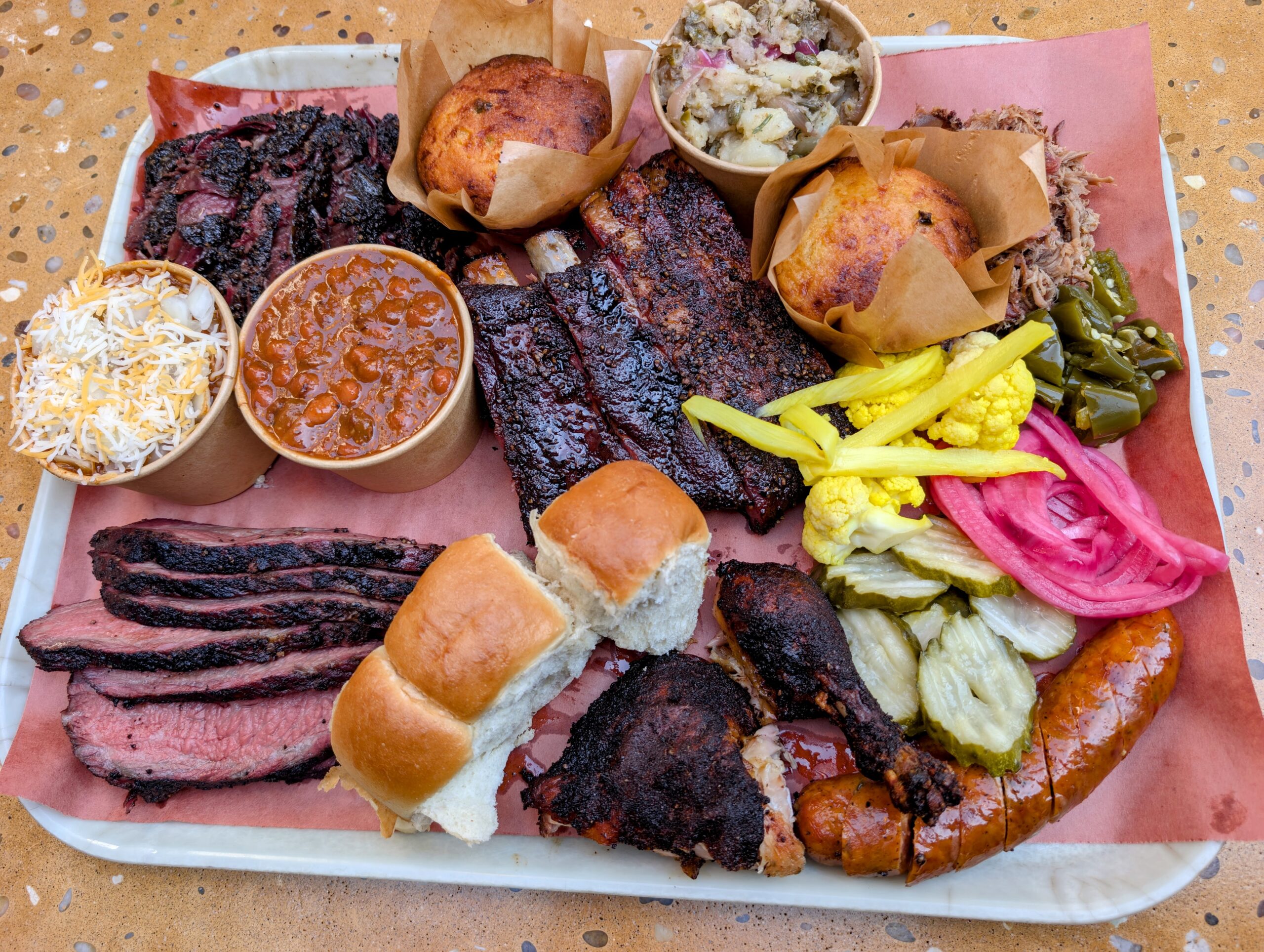Thực khách đến đây sẽ gọi các món ăn tại quầy, sau đó các đầu bếp sẽ cắt thịt đã nướng rồi múc các món ăn kèm cho khách. Vì muốn thử nhiều loại thịt, tôi gọi một mâm thịt dành cho hai đến bốn người, có thịt thăn bò nướng, thịt heo xé phay, sườn heo nướng, gà nướng và xúc xích. Phần này còn có thêm ba món ăn kèm, và tôi chọn đậu hầm, món “chili” với một phần xà lách khoai tây. Tôi còn gọi thêm một chút của món thịt đặc biệt của Harper Barbecue là thịt má bò xông khói, và thêm một phần nui với phô mai.