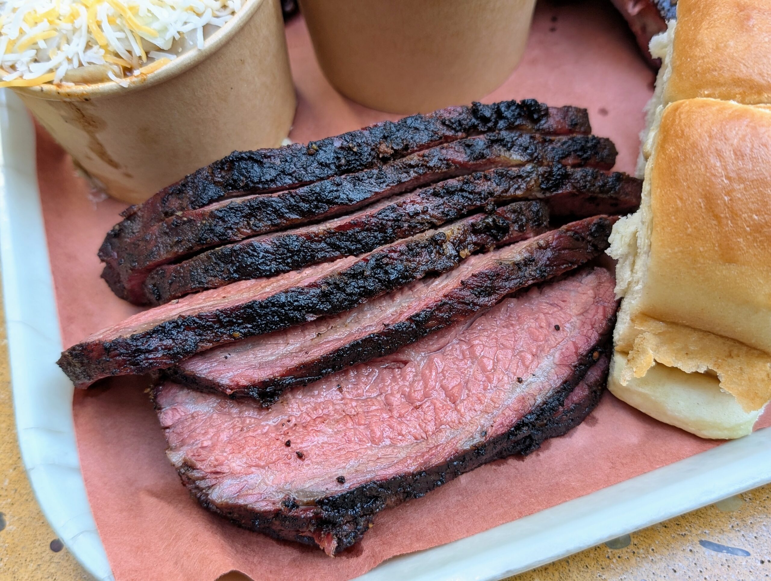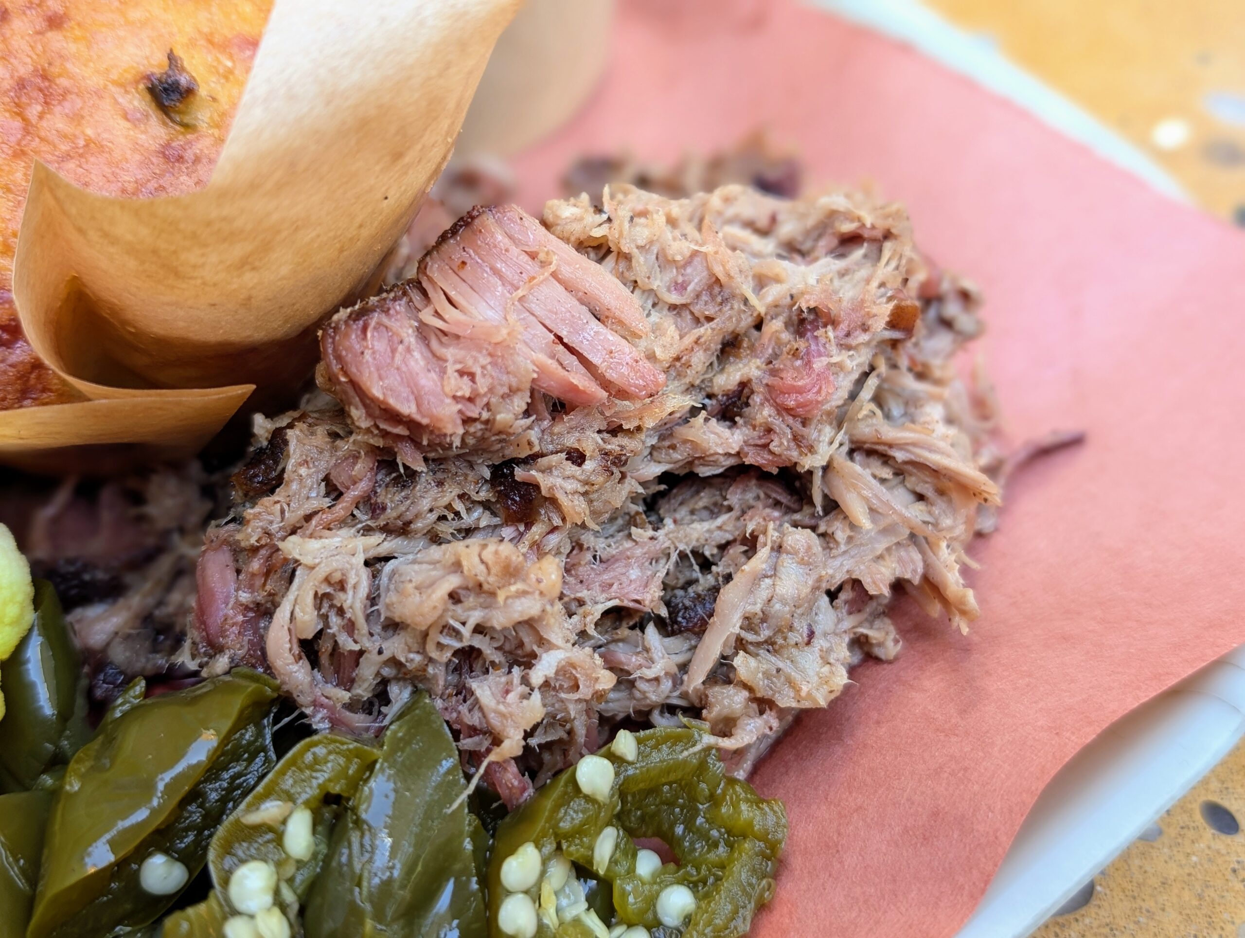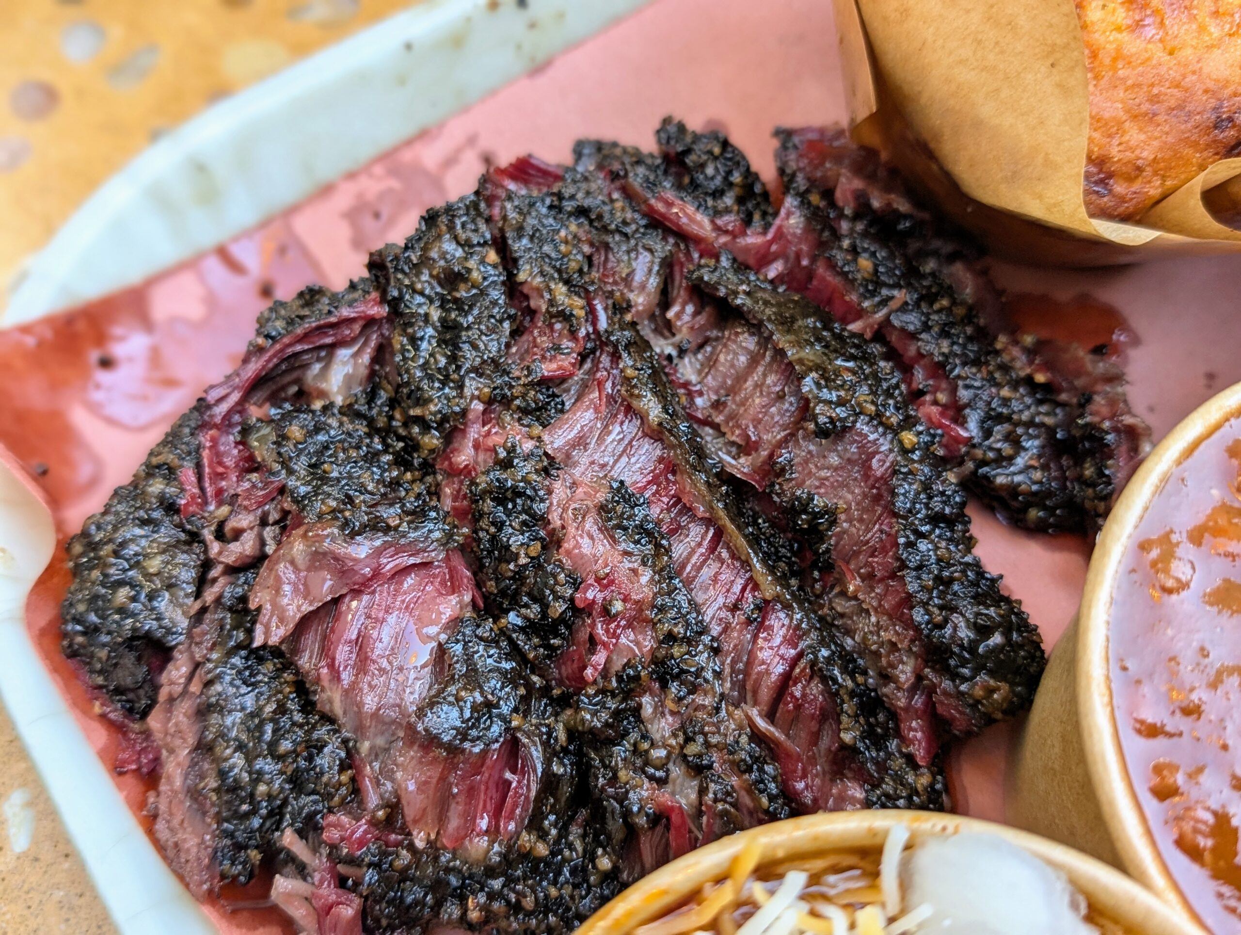 Cuối cùng là thịt má bò xông khói mà tôi chưa bao giờ thấy tại các tiệm thịt nướng xông khói khác. Đây là một phần thịt quen thuộc tại các tiệm ăn của người Mexico, thường được hầm nhừ rồi kẹp vào taco, nhưng Harper Barbecue lại xông khói má bò.
