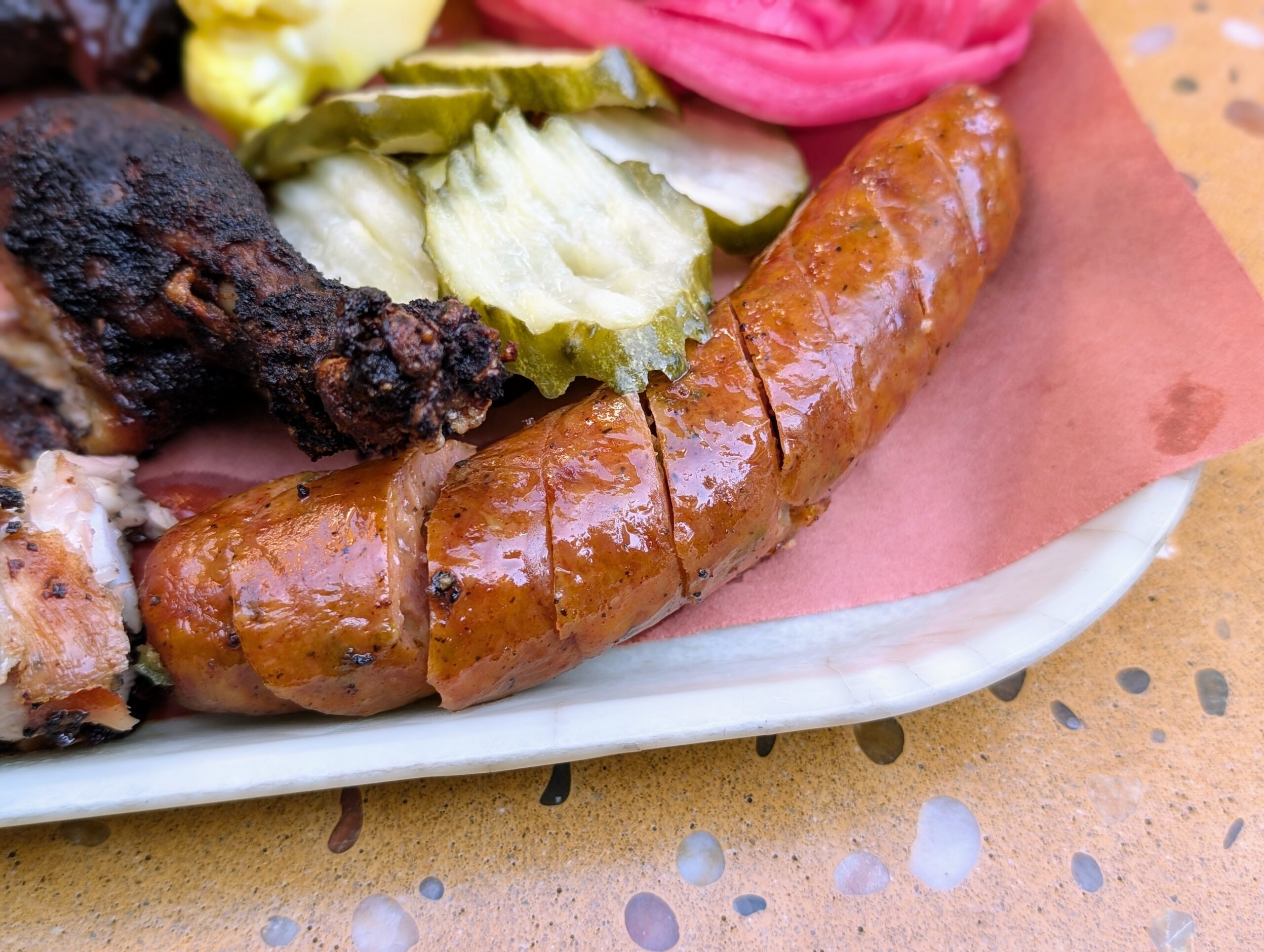 Xúc xích được làm theo kiểu Đức, nhưng nhân bên trong là hai nguyên liệu quen thuộc của xúc xích Texas là phô mai cheddar với ớt jalapeno. Xúc xích có lớp ruột heo thật để nhồi thịt vào trong nên lớp da có độ giòn và cắn vào có tiếng “tạch.” Thịt xúc xích bên trong thì mặn mà, thơm béo, có vị cay nhẹ của ớt jalapeno và phô mai cheddar có vị hơi nồng với vị béo ngon không thể chê.