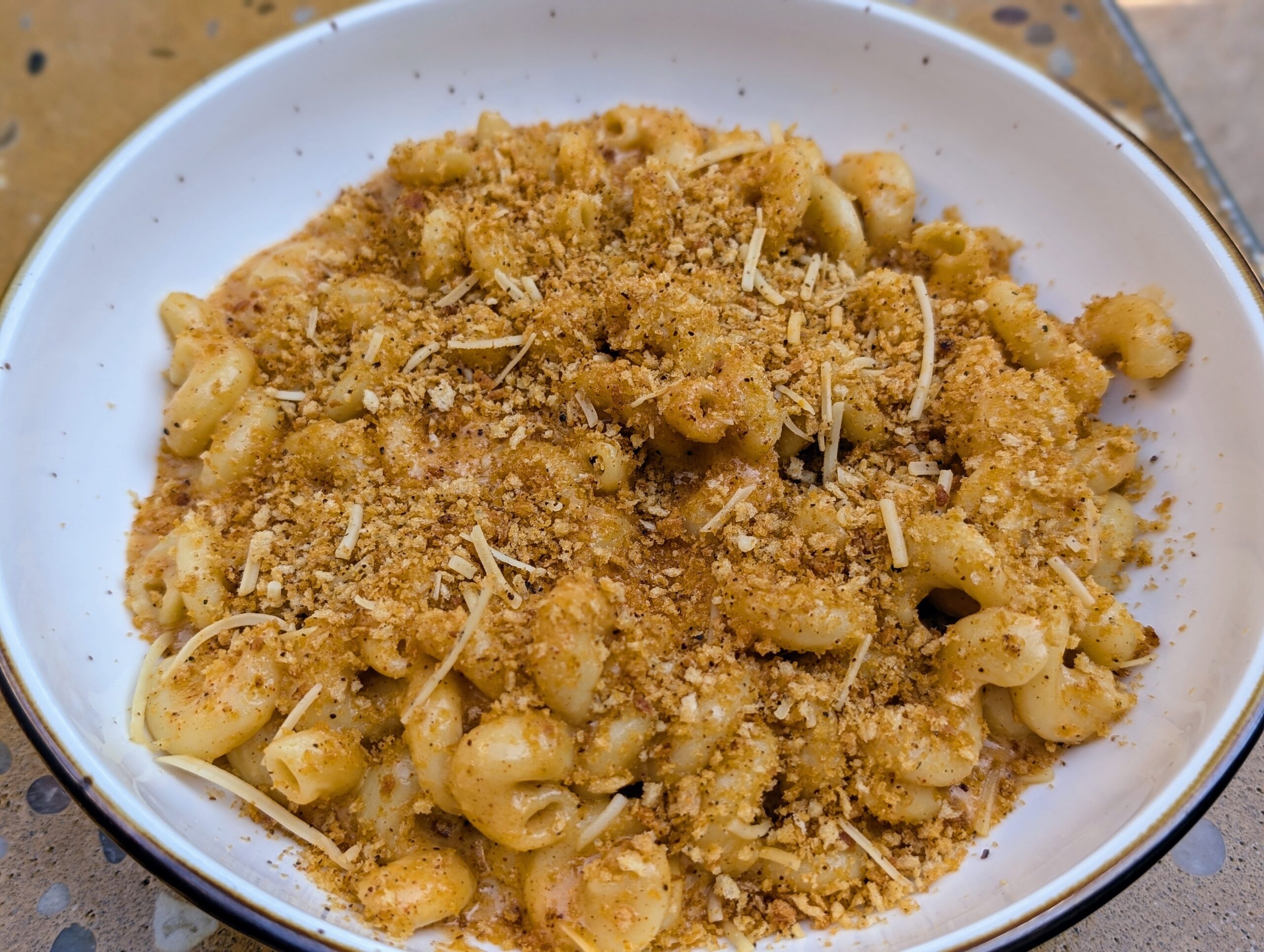 Món nui nấu với phô mai thì sử dụng loại nui xoắn của Ý, có đến năm loại phô mai trước nước xốt và được rắc vụn bánh mì giòn với chút phô mai parmesan ở trên. Từng sợi nui mềm mại, nhưng không bị nát, thấm vị thơm béo với hơi nồng của nước xốt phô mai rất ngon. Lớp vụn bánh mì tạo độ giòn cho món ăn, còn phô mai parmesan thì mang thêm vị mặn, càng làm nước xốt phô mai ngon hơn.