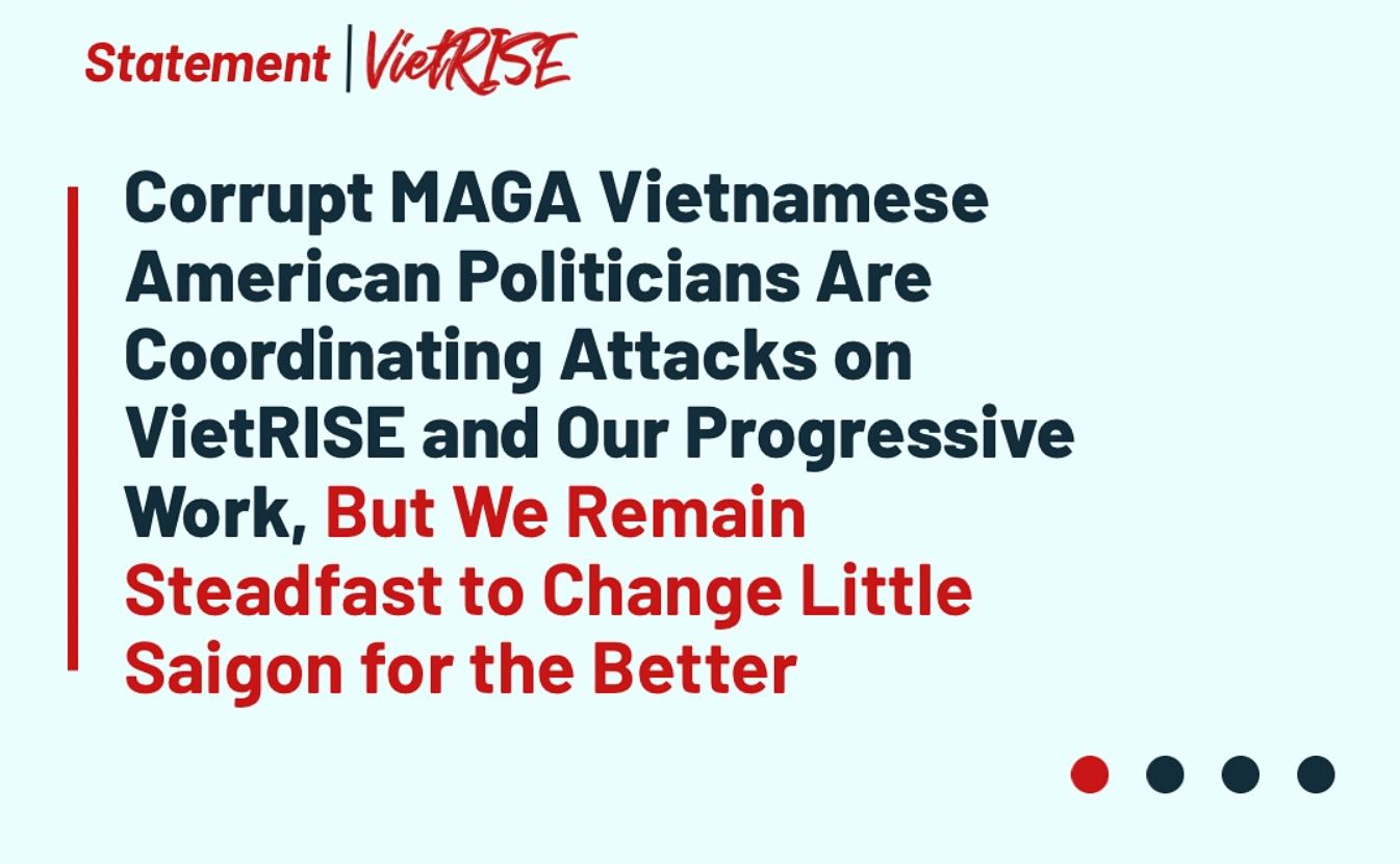VietRISE còn tố cáo các “chính trị gia MAGA” tấn công họ vì những công việc giúp đỡ cộng về các vấn đề như giúp gia đình không bị chia cách, giúp các vị cao niên có chỗ ở và giúp thế hệ trẻ thoải mái trình bày suy nghĩ. Họ cho hay đó là những vấn đề mà “những lãnh đạo không đủ khả năng, gầy dựng sự nghiệp bằng tham nhũng và quản lý các nguồn lực không đúng cách, làm ngơ.”