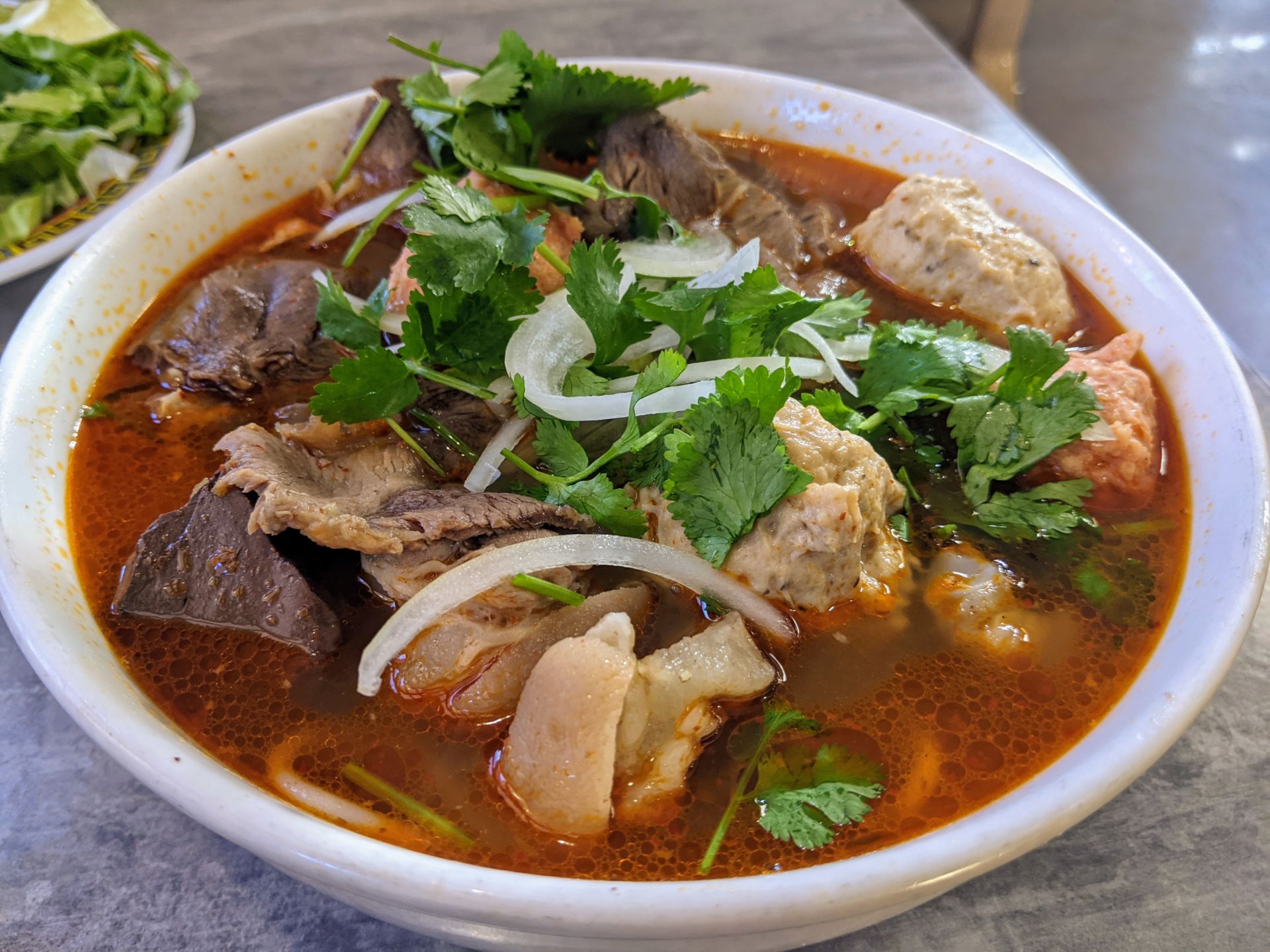 Nước súp có vị ngọt của xương, có vị cay vừa phải rất hấp dẫn, và ngạc nhiên là đậm đà vị mắm ruốc, nhưng đầu bếp không cho ruốc quá tay. Mùi nồng của ruốc rất hợp với vị ngọt của xương và vị cay của sa tế. Những tô bún bò tôi từng ăn ở Orange County không có vị ruốc đậm đà như vậy, nên tôi rất ngạc nhiên.