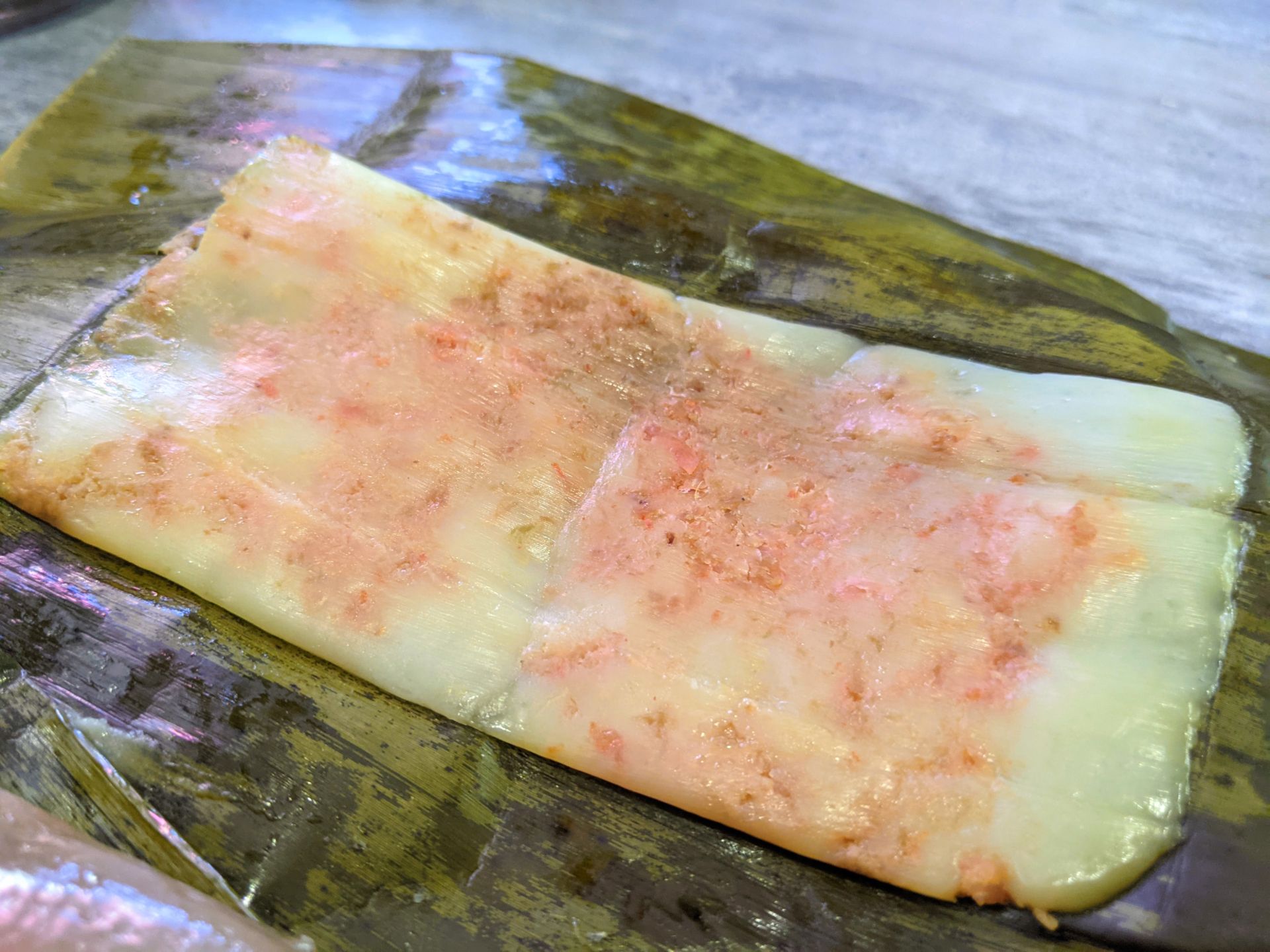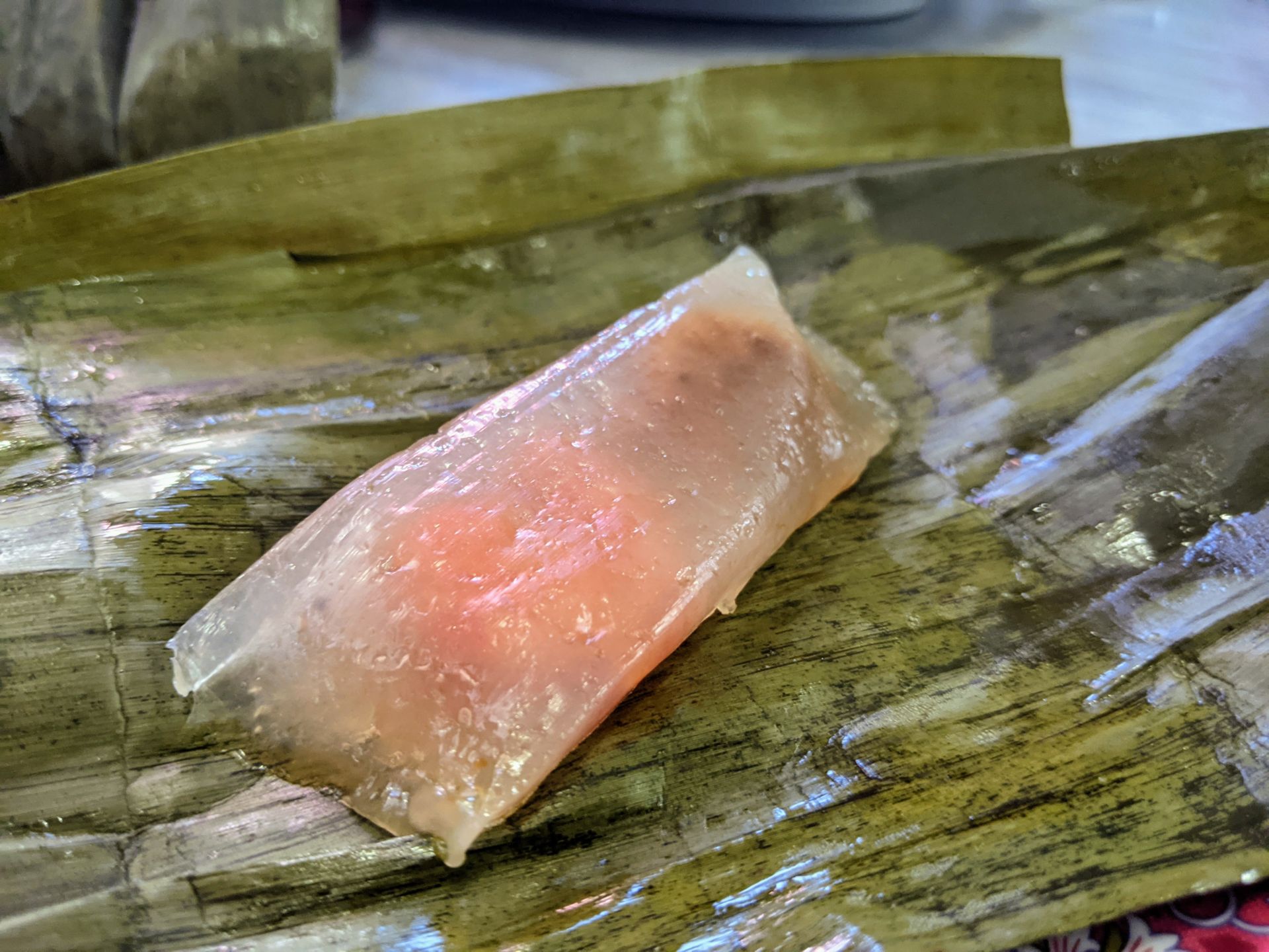 Tôi khai vị bằng hai loại bánh trước. Một phần bánh có năm cái, và đều được gói lá chuối rất đúng kiểu. Bánh bột lọc có lớp vỏ dẻo dai, bên trong có tôm và thịt mỡ. Vỏ bánh thơm mùi lá chuối và nhai rất đã miệng, đậm đà vị tôm và vị béo của thịt mỡ. Tôi nghĩ không cần phải chấm nước mắm bánh vẫn ngon, nhưng chấm vào có thêm vị ngọt rất hấp dẫn.
