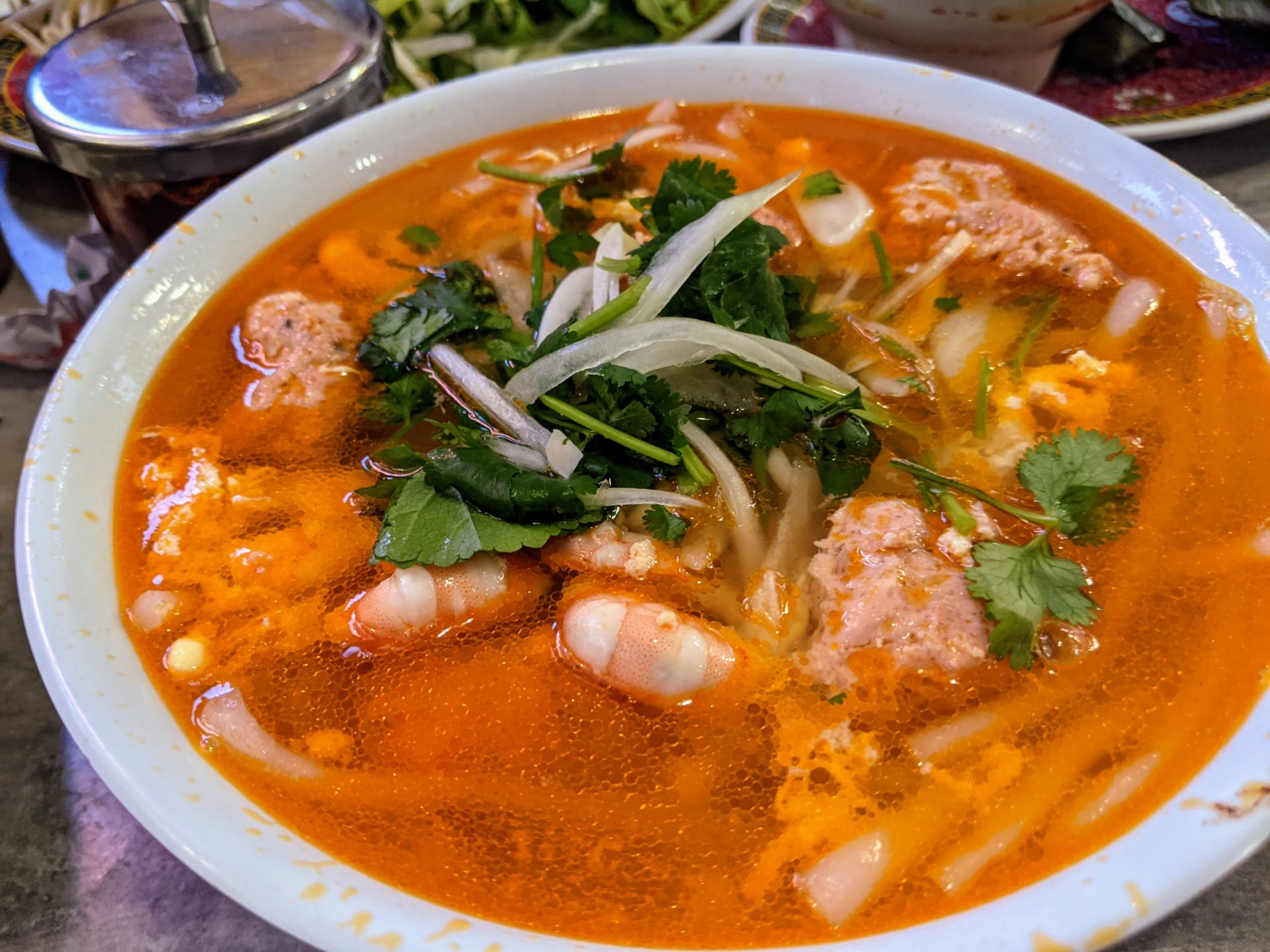 Tuy nhiên, lần đầu đến đây tôi chưa ăn thử bún bò nên lần này phải gọi thử. Tôi gọi một tô bún bò đặc biệt, có tên “bún tầm Hoài Huế” trên thực đơn, một phần bánh bột lọc, một phần bánh nậm, và một tô bánh canh tôm cua.