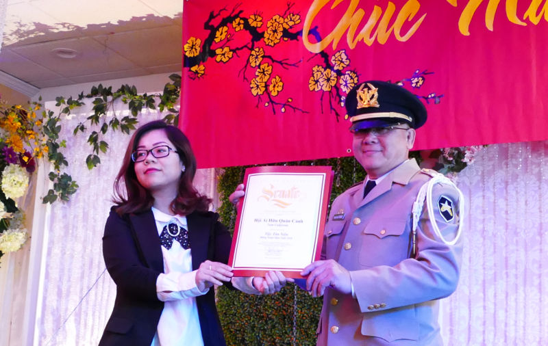 Trong dịp này, cô Jenny Trần, đại diện Thượng Nghị Sĩ Janet Nguyễn, gởi lời chúc mừng năm mới và vinh dự được trao tặng bằng vinh danh đến Hội Ái Hữu Quân Cảnh Nam California.