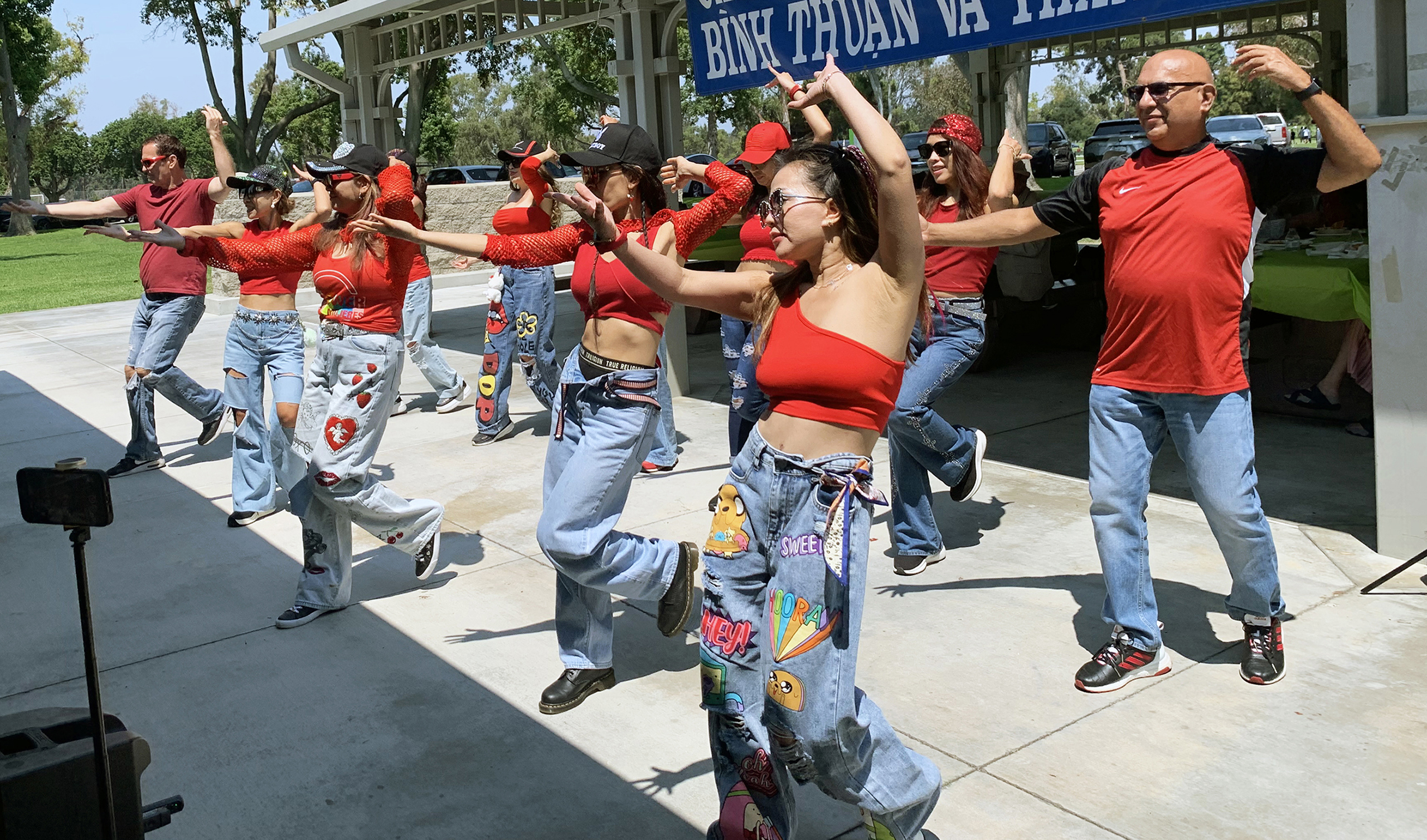 Cô Tracy Nguyễn, đồng hương Bình Thuận, thành viên trong nhóm Cathy Rumba, chia sẻ: “Hôm nay, nhóm chúng tôi đến trình diễn những tiết mục múa để đóng góp chương trình văn nghệ cho bà con thưởng thức. Các điệu múa chúng tôi rất hồn nhiên, có lợi cho sức khỏe, và cũng có đường nét sống động. Chúng tôi cũng không quên được những món ăn đặc thù của quê hương Bình Thuận là bánh tráng chấm mắm ruốc. Hôm nay còn rất nhiều món đặc thù của quê hương mình, đặc biệt nhất là cá chả và nước mắm Phan Thiết.”