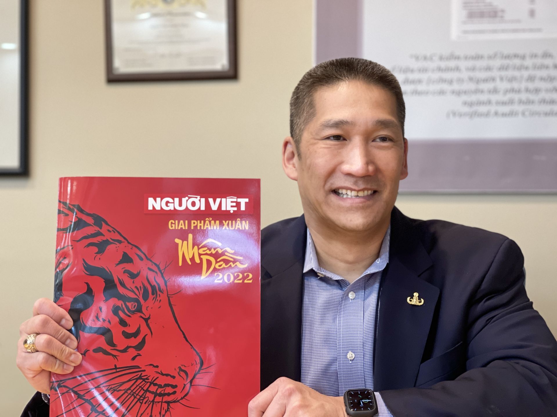 Ông Hùng Cao, cựu Hải Quân đại tá Hoa Kỳ, và cuốn Giai Phẩm Xuân Người Việt 2022. (Hình: Trà Nhiên/Người Việt)