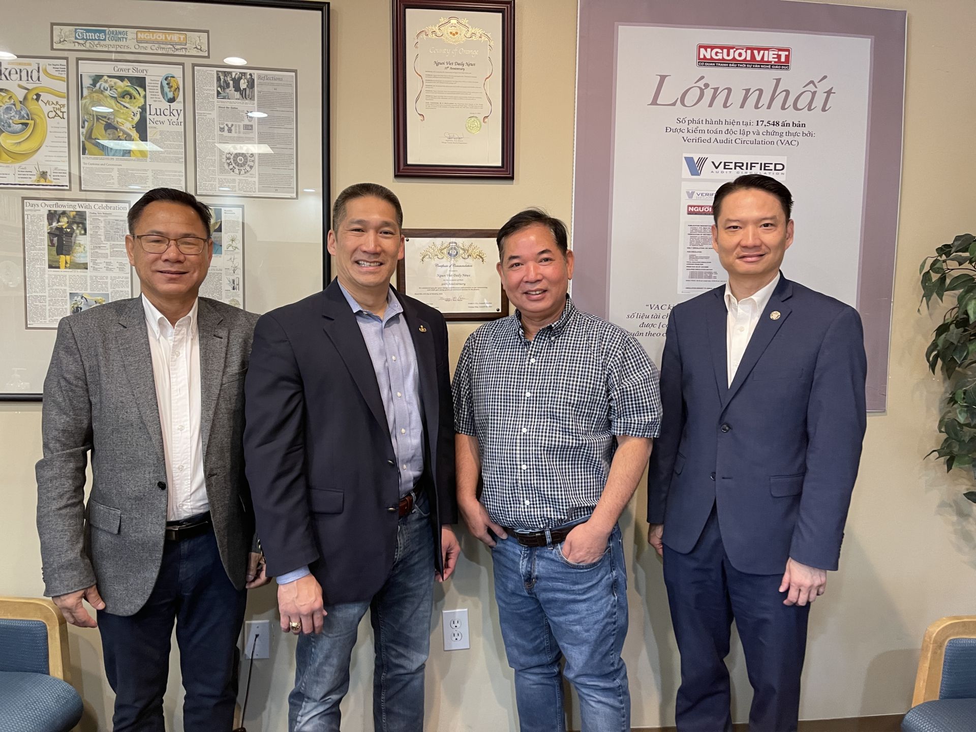 Từ trái: Ông Charlie Nguyễn Mạnh Chí, nghị viên Westminster; ông Hùng Cao, ứng cử viên dân biểu Hạ Viện Hoa Kỳ; ông Đỗ Tài Thắng, tổng thư ký nhật báo Người Việt; và ông Trí Tạ, thị trưởng Westminster. (Hình: Trà Nhiên/Người Việt)