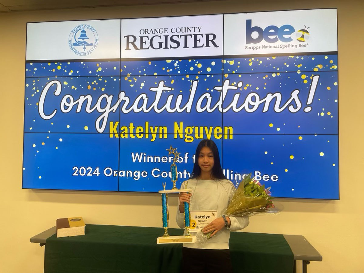 HUNTINGTON BEACH, California (NV) – Học sinh Katelyn Nguyễn, lớp Bảy trường Helen Stacey Intermediate School, Huntington Beach, vừa đoạt giải nhất cuộc thi đánh vần ở Orange County, trở thành học sinh đầu tiên của Học Khu Westminster đạt thành tích này, và đang chuẩn bị tham gia cuộc thi đánh vần toàn quốc Scripps National Spelling Bee ở Washington, DC vào Tháng Năm.