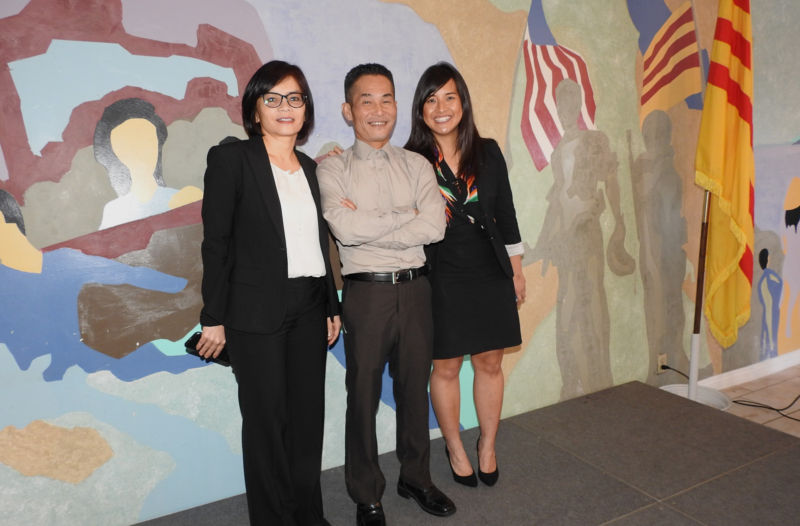 Anh Tùng Nguyễn (giữa), Luật Sư Phi Nguyễn (phải) và Luật Sư Laboni Hoq, AAAJA- LA. (Hình: Linh Nguyễn/Người Việt)