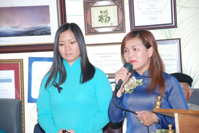 Cô Thu Hà, nữ nghị viên của thành phố Garden Grove và anh Billy Lê, cựu chủ Tịch Tổng Hội SVVN Nam California cũng bầy tỏ lòng tri ơn đến Hội Đền Hùng Hải Ngoại đã hàng năm nhắc nhở tuổi trẻ gốc Việt nhớ đến tổ tiên nguồn gốc. Cô Thu Hà cũng giới thiệu cô Hồ Quỳnh Giang Savah, đương kim Chủ Tịch Tổng Hội Sinh Viên Việt Nam Nam California. Cô Giang trong dịp này xin được loan báo những sinh hoạt của tuổi trẻ Việt Nam trong dịp Tháng Tư năm nay, đó là cuộc hội thảo của tuổi trẻ về cuộc chiến Việt Nam. Sau đó cô đã thay mặt Hội đưa tặng mỗi người một “Nơ” đen cài lên áo trong những ngày Tưởng Niệm Tháng Tư Đen.